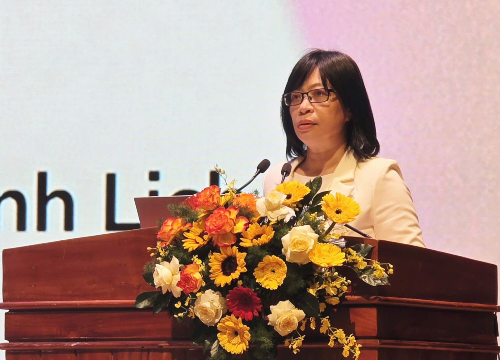 Phó Chủ tịch UBND tỉnh Nguyễn Thị Thanh Lịch báo cáo tại hội nghị.
