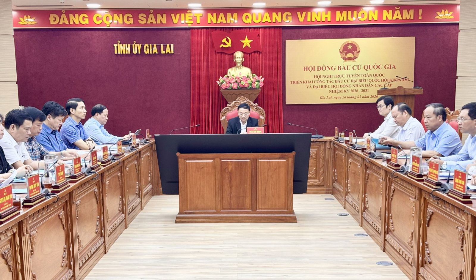 Chủ trì hội nghị có các đồng chí: Trần Thanh Mẫn – Ủy viên Bộ Chính trị, Chủ tịch Quốc hội, Chủ tịch Hội đồng Bầu cử Quốc gia; Bùi Thị Minh Hoài – Ủy viên Bộ Chính trị, Bí thư Trung ương Đảng, Chủ tịch Ủy ban Trung ương MTTQ Việt Nam, Phó Chủ tịch Hội đồng Bầu cử Quốc gia; Võ Thị Ánh Xuân – Bí thư Trung ương Đảng, Phó Chủ tịch nước, Phó Chủ tịch Hội đồng Bầu cử Quốc gia; Nguyễn Hòa Bình – Phó Thủ tướng Thường trực Chính phủ, Phó Chủ tịch Hội đồng Bầu cử Quốc gia; Nguyễn Thị Thanh – Ủy viên Trung ương Đảng, Phó Chủ tịch Quốc hội, Ủy viên Hội đồng Bầu cử Quốc gia.