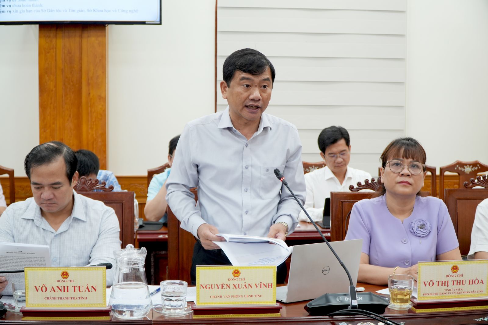 Chánh Văn phòng UBND tỉnh Nguyễn Xuân Vĩnh (giữa) báo cáo kết quả thực hiện nhiệm vụ được giao và kết quả giải quyết hồ sơ TTHC.