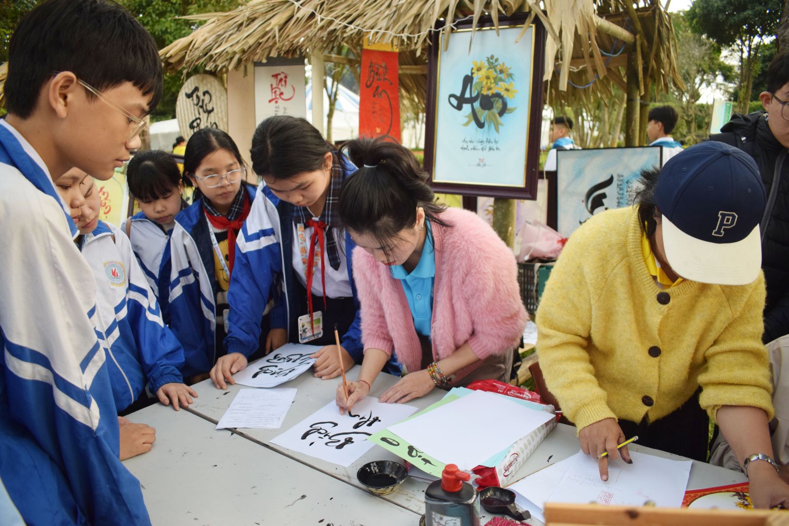 Các em học sinh thích thú tại quầy viết chữ Thư pháp