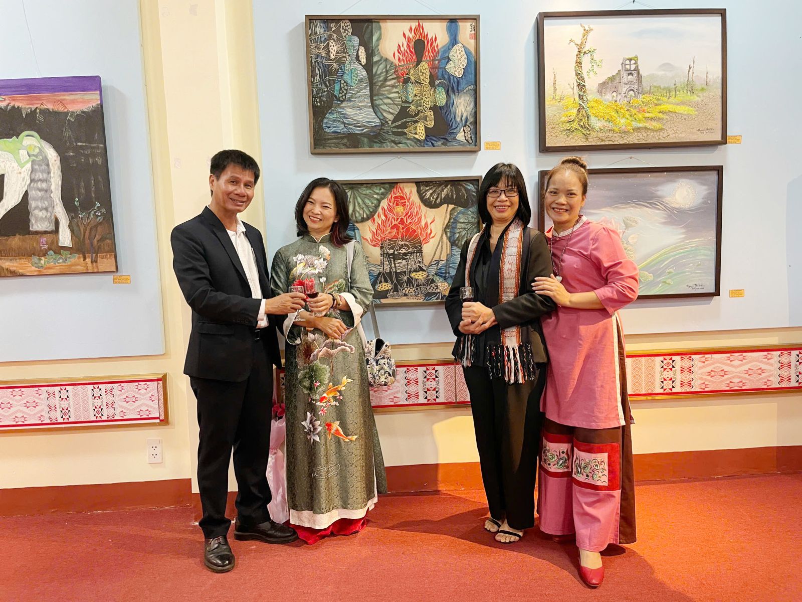 Phó Chủ tịch UBND tỉnh Nguyễn Thị Thanh Lịch chụp hình lưu niệm với các hoạ sĩ bên các tác phẩm nghệ thuật tại phòng trưng bày