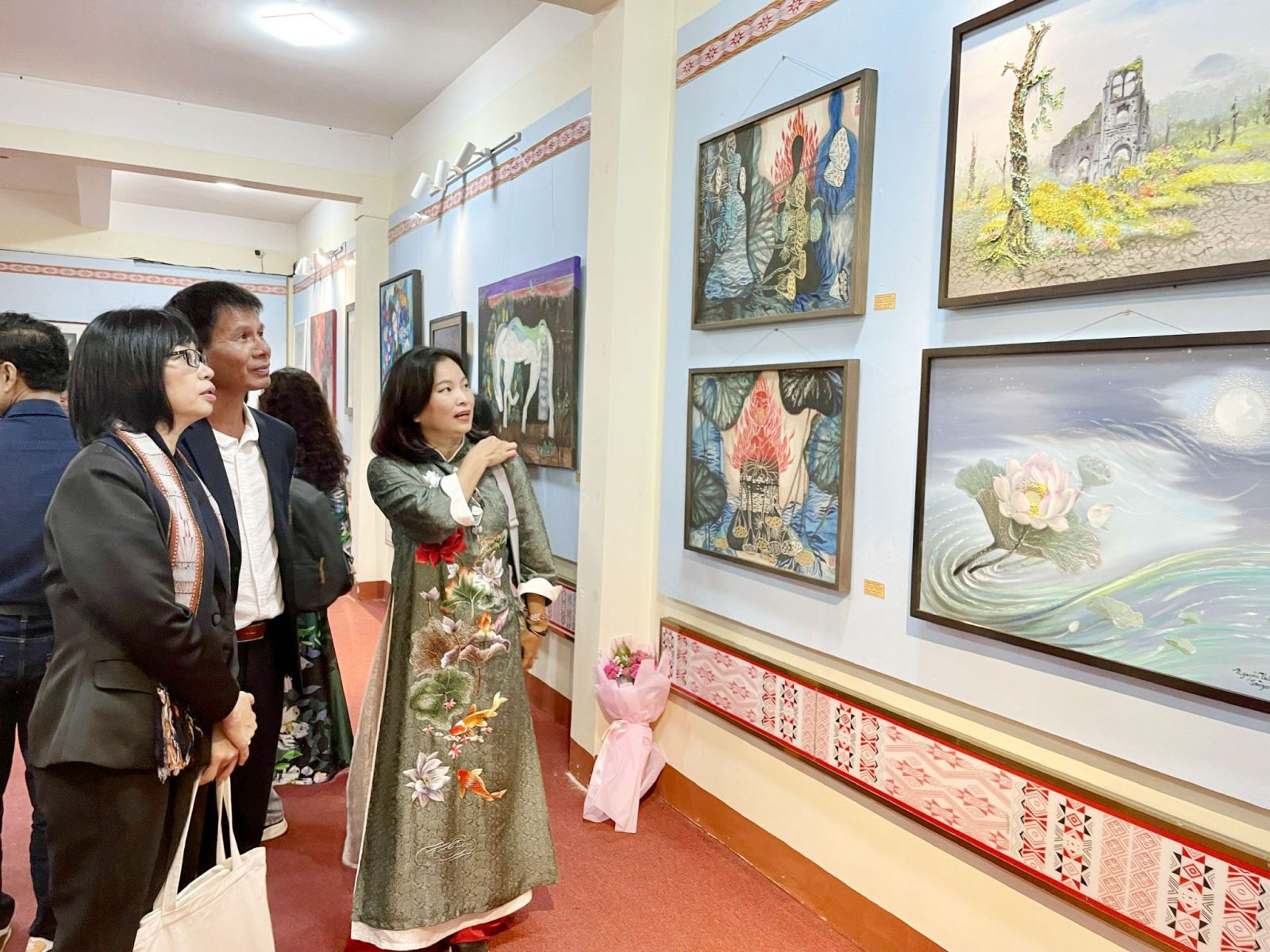 Phó Chủ tịch UBND tỉnh Nguyễn Thị Thanh Lịch thưởng lãm tranh tại phòng trưng bày chuyên đề Bảo tàng Pleiku