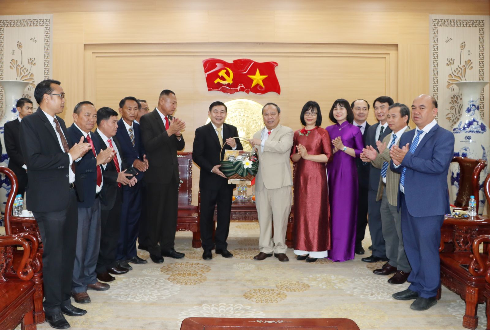 Phó Bí thư Tỉnh ủy Châu Ngọc Tuấn chào mừng đoàn đại biểu cấp cao tỉnh Salavan đến thăm và chúc Tết.