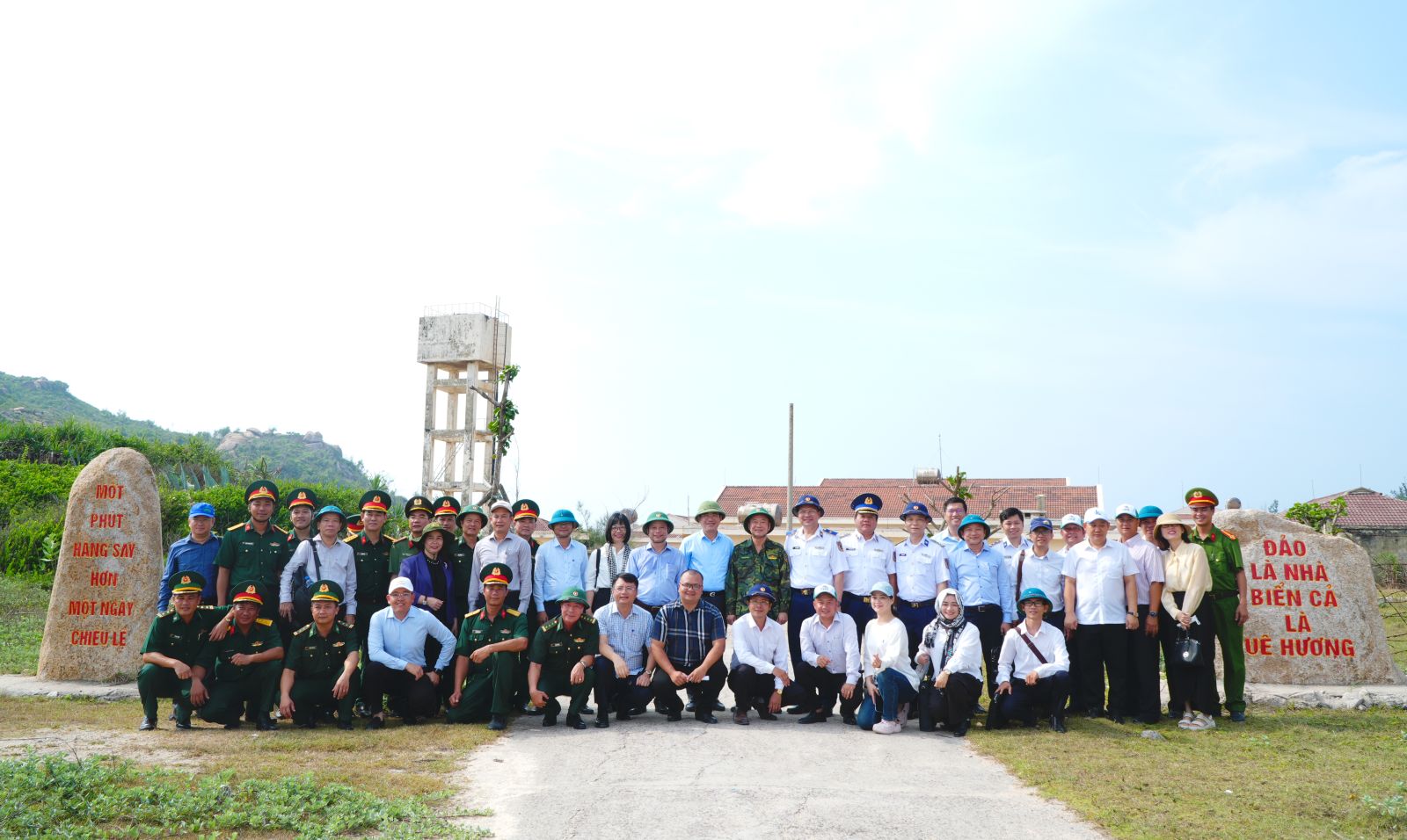 Đoàn công tác chụp ảnh lưu niệm với cán bộ, chiến sĩ làm nhiệm vụ trên đảo Nhơn Châu.