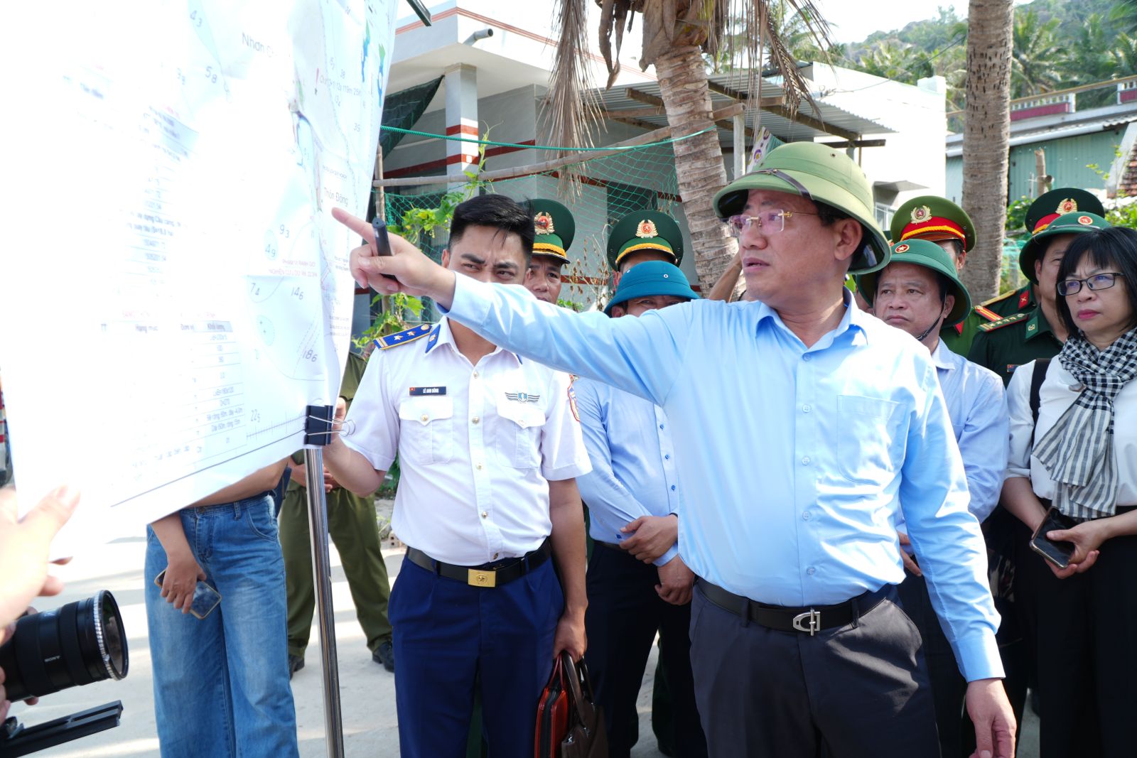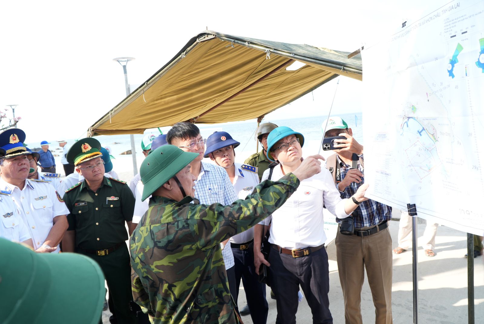 Tại xã đảo Nhơn Châu, đoàn công tác đã khảo sát thực địa và nghe đơn vị tư vấn báo cáo phương án quy hoạch vị trí xây dựng đơn vị Hải đội Cảnh sát biển.