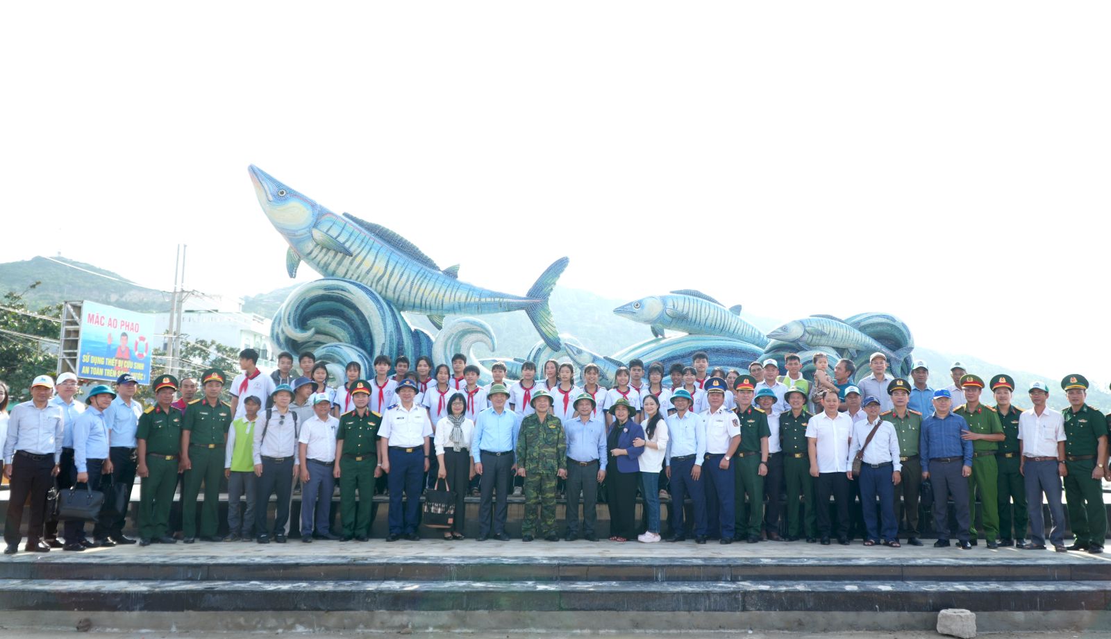 Đoàn công tác chụp ảnh lưu niệm với học sinh trên đảo Nhơn Châu.