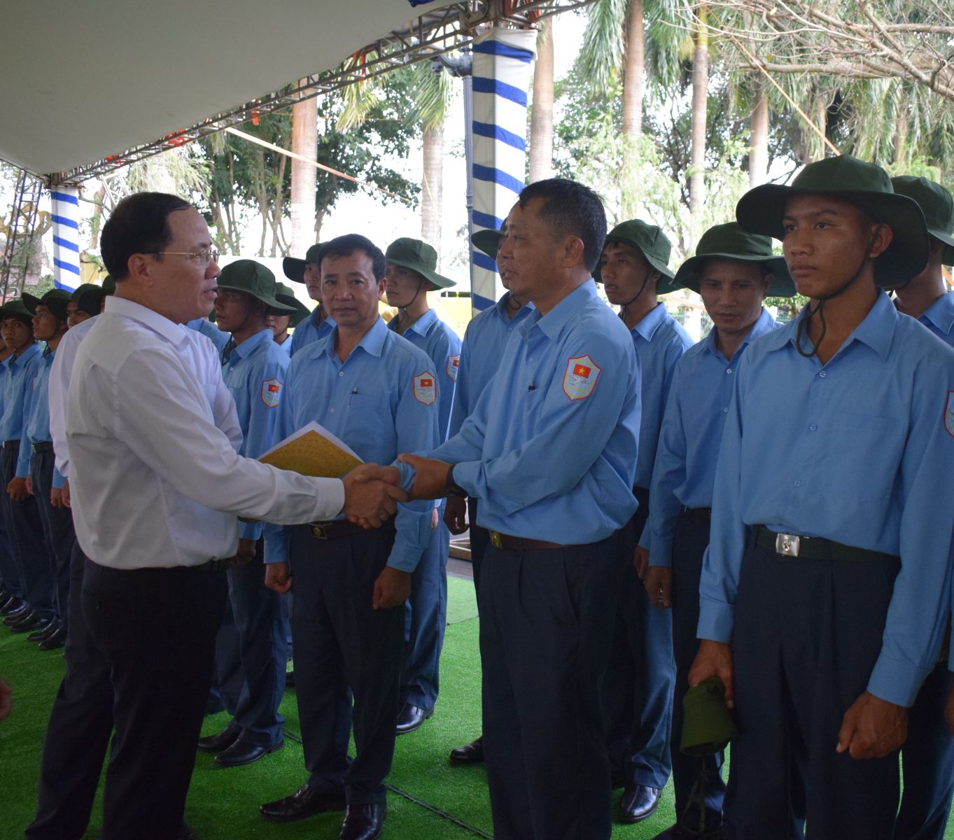Chủ tịch UBND tỉnh Gia Lai Phạm Anh Tuấn động viên cán bộ, chiến sĩ Đội K52 đã hoàn thành tốt nhiệm vụ tìm kiếm, quy tập hài cốt các liệt sĩ
