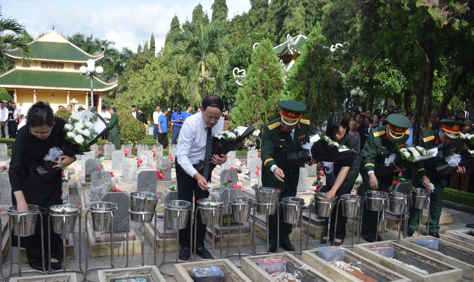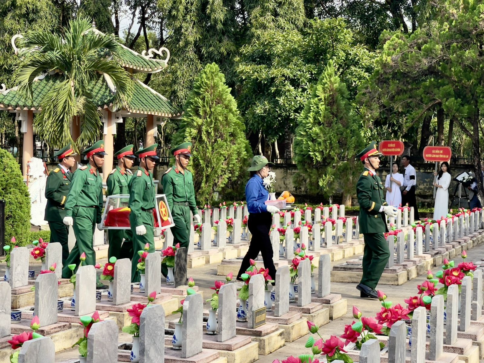 Trong không khí thiêng liêng, trang nghiêm của buổi lễ, các đại biểu đã thực hiện nghi thức thỉnh chuông và thành kính dâng hoa, dâng hương để tưởng nhớ, tri ân, tiễn đưa các anh hùng liệt sĩ- những người con ưu tú của Tổ quốc đã anh dũng ngã xuống vì độc lập, tự do của dân tộc về với đất mẹ yêu thương. Đây không chỉ là sự tri ân mà còn là dịp để nhắc nhở, giáo dục thế hệ hôm nay và mai sau về giá trị của hòa bình, về trách nhiệm gìn giữ thành quả cách mạng mà các thế hệ cha anh đã đánh đổi bằng cả tuổi xuân và sự sống.