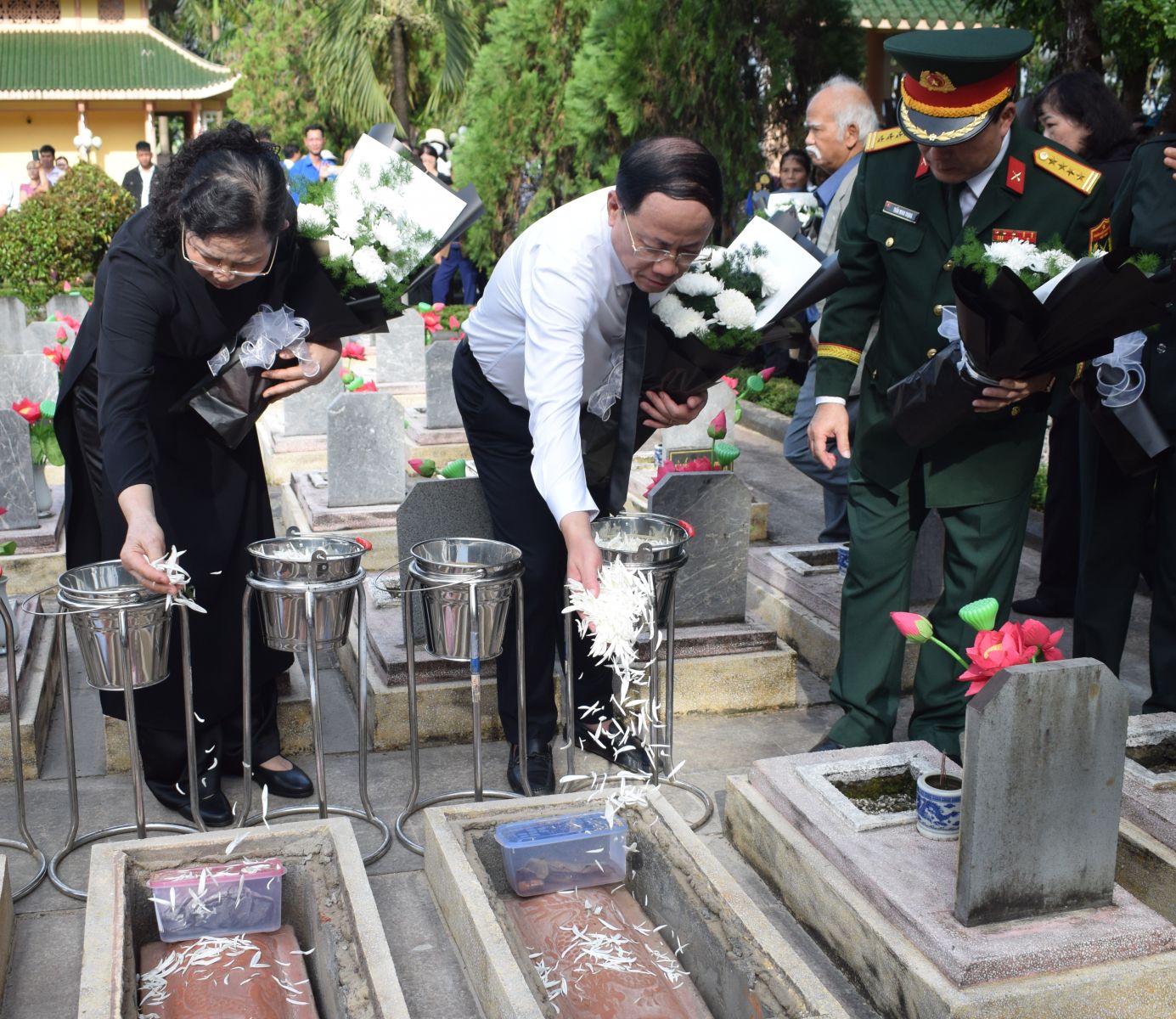 Đồng chí Lê Thị Thủy - Ủy viên Ban Chấp hành Trung ương Đảng, Phó Bí thư Đảng ủy Chính phủ (ngoài cùng bên trái) và Chủ tịch UBND tỉnh Gia Lai Phạm Anh Tuấn (thứ 2 từ trái qua) rải hoa lên phần mộ các liệt sĩ