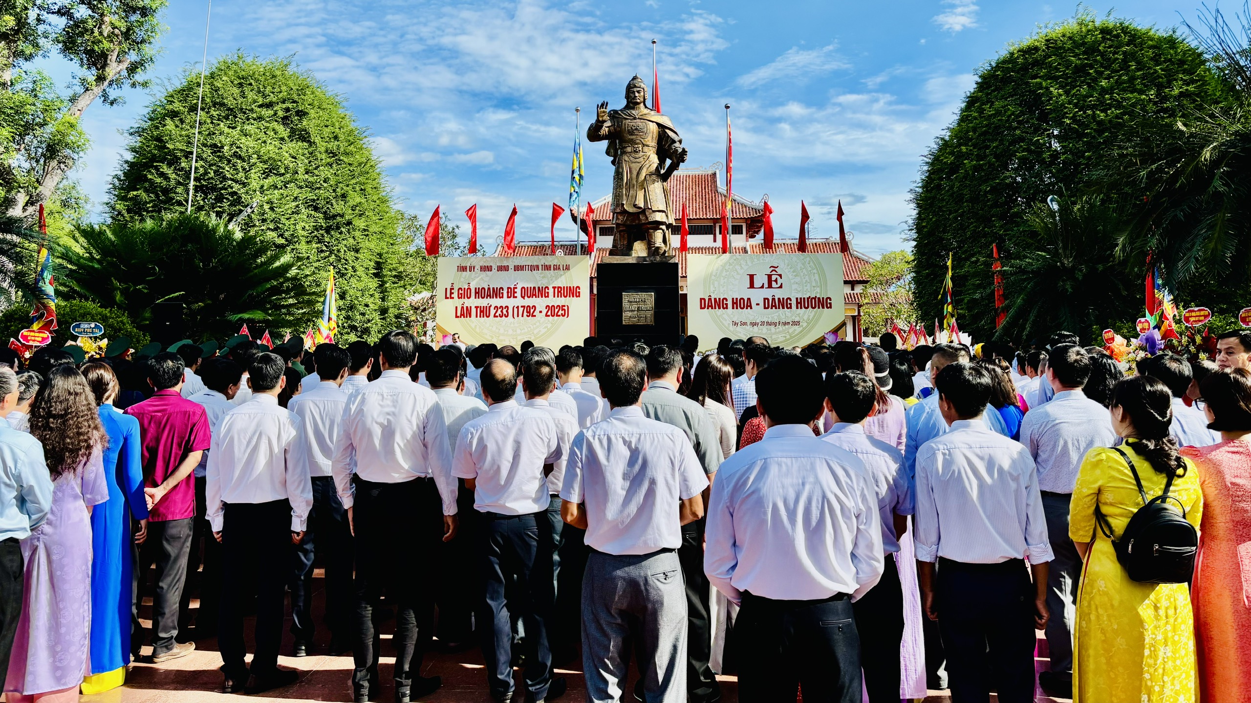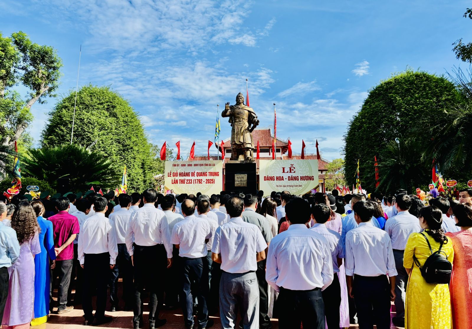 Trong không khí trang nghiêm, lãnh đạo Tỉnh ủy, HĐND, UBND, Ủy ban Mặt trận Tổ quốc Việt Nam cùng lãnh đạo các sở, ban, ngành, địa phương, các đơn vị lực lượng vũ trang cùng các tầng lớp nhân dân đã dâng hoa trước tượng đài Hoàng đế Quang Trung và dâng hương tại Đền thờ Tây Sơn Tam Kiệt nhằm bày tỏ lòng thành kính, tưởng nhớ và tri ân công lao to lớn của vị anh hùng dân tộc Quang Trung-Nguyễn Huệ trong sự nghiệp đấu tranh dựng nước và giữ nước.