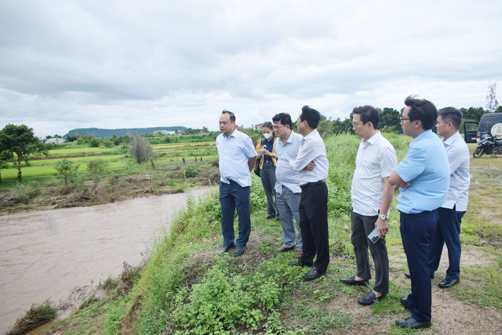Phó Chủ tịch UBND tỉnh Dương Mah Tiệp (ngoài cùng bên trái) kiểm tra tại bờ Đông sông Ia Sol xã Phú Thiện