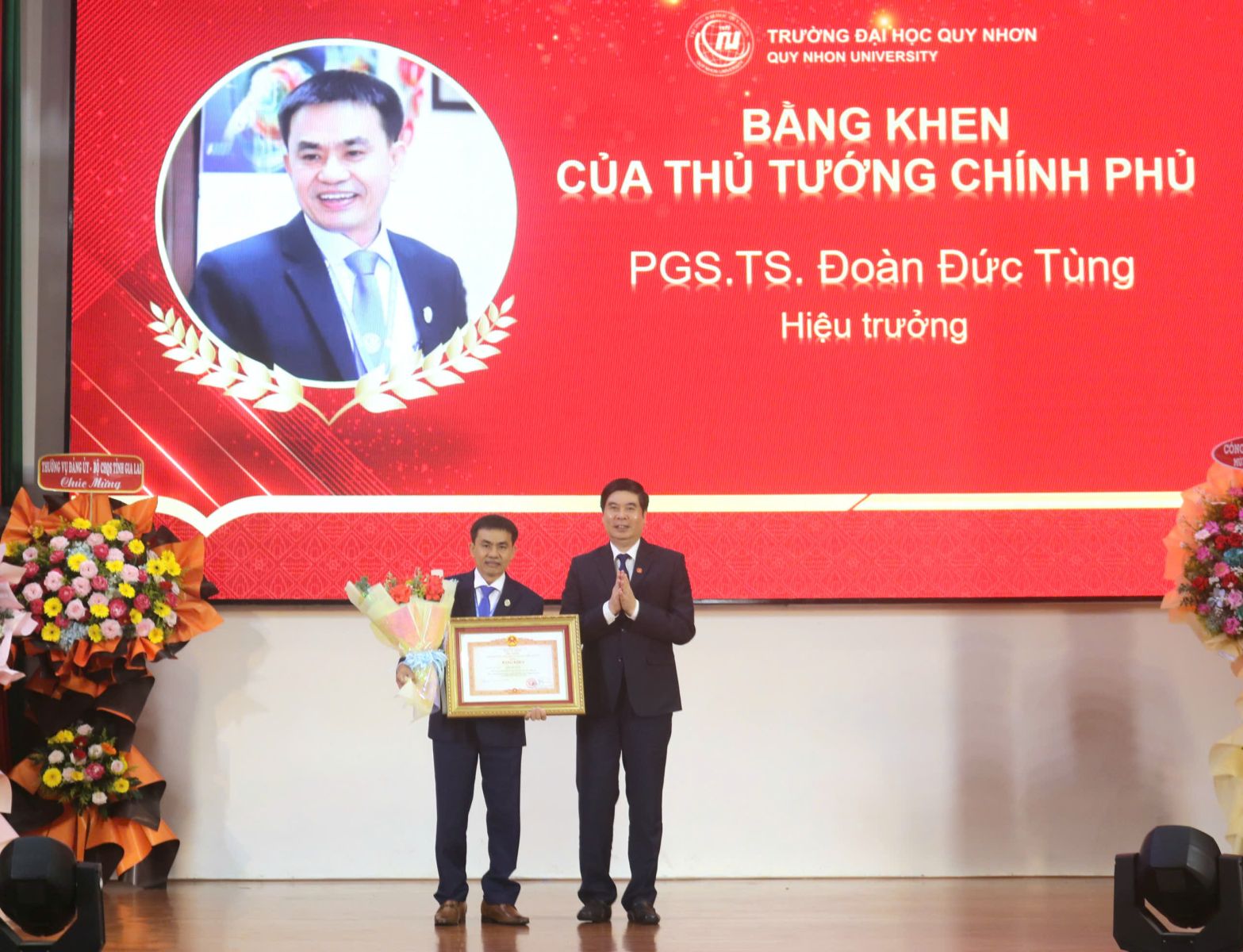 Tại buổi lễ, PGS.TS Đoàn Đức Tùng - Hiệu trưởng Trường Đại học Quy Nhơn nhận Bằng khen của Thủ tướng Chính phủ vì đã có nhiều thành tích trong công tác, góp phần vào sự nghiệp xây dựng chủ nghĩa xã hội và bảo vệ Tổ quốc; 04 cá nhân thuộc Trường Đại học Quy Nhơn nhận Bằng khen của Chủ tịch UBND tỉnh vì đã có thành tích xuất sắc trong hoạt động giáo dục và đào tạo giai đoạn 2022 - 2024; nhiều tập thể, cá nhân nhận Bằng khen của Bộ Giáo dục và Đào tạo vì đã có thành tích xuất sắc trong phong trào thi đua đổi mới sáng tạo trong quản lý, giảng dạy và học tập giai đoạn 2020 - 2025 và giai đoạn 2022 - 2024./.