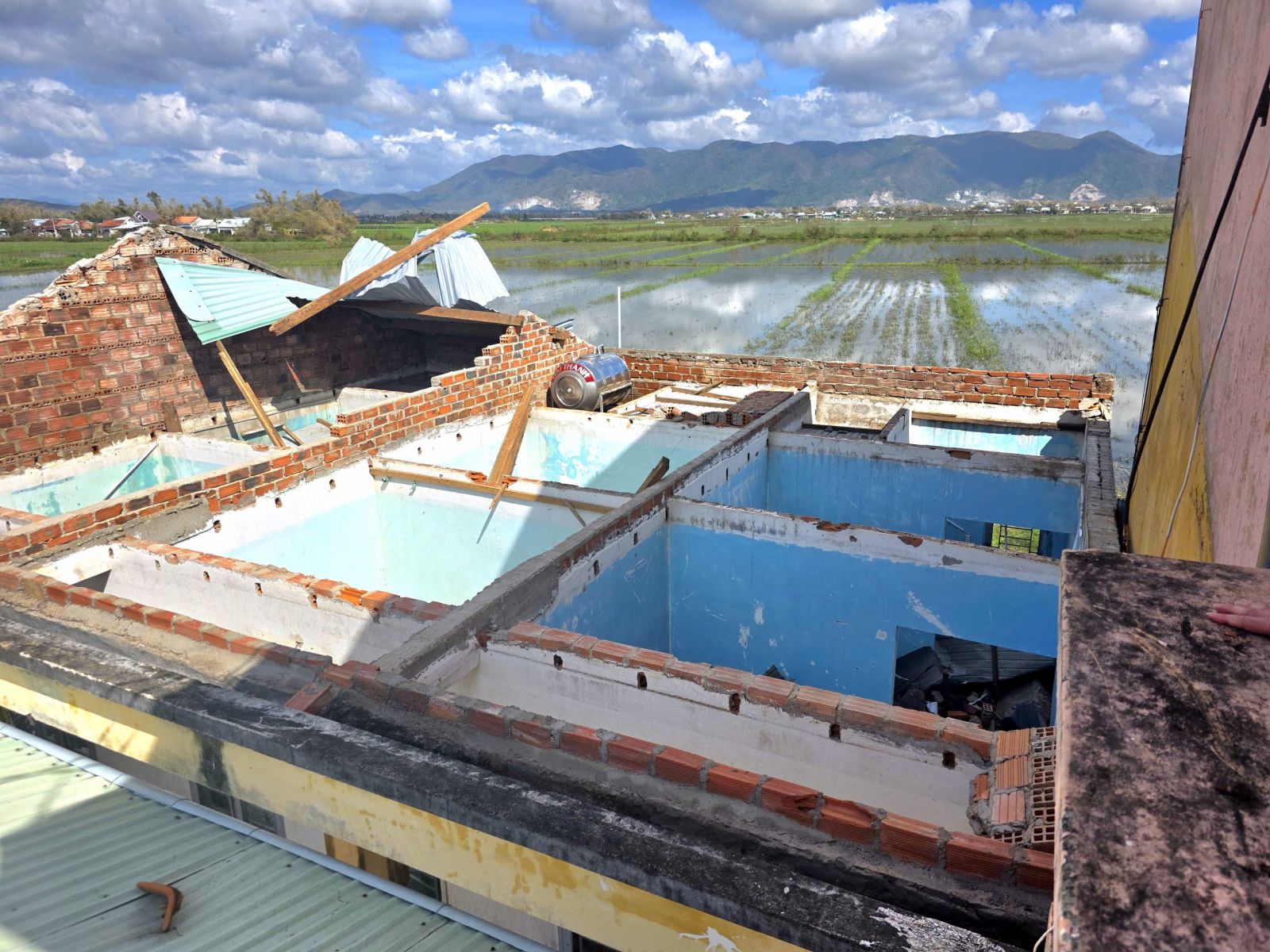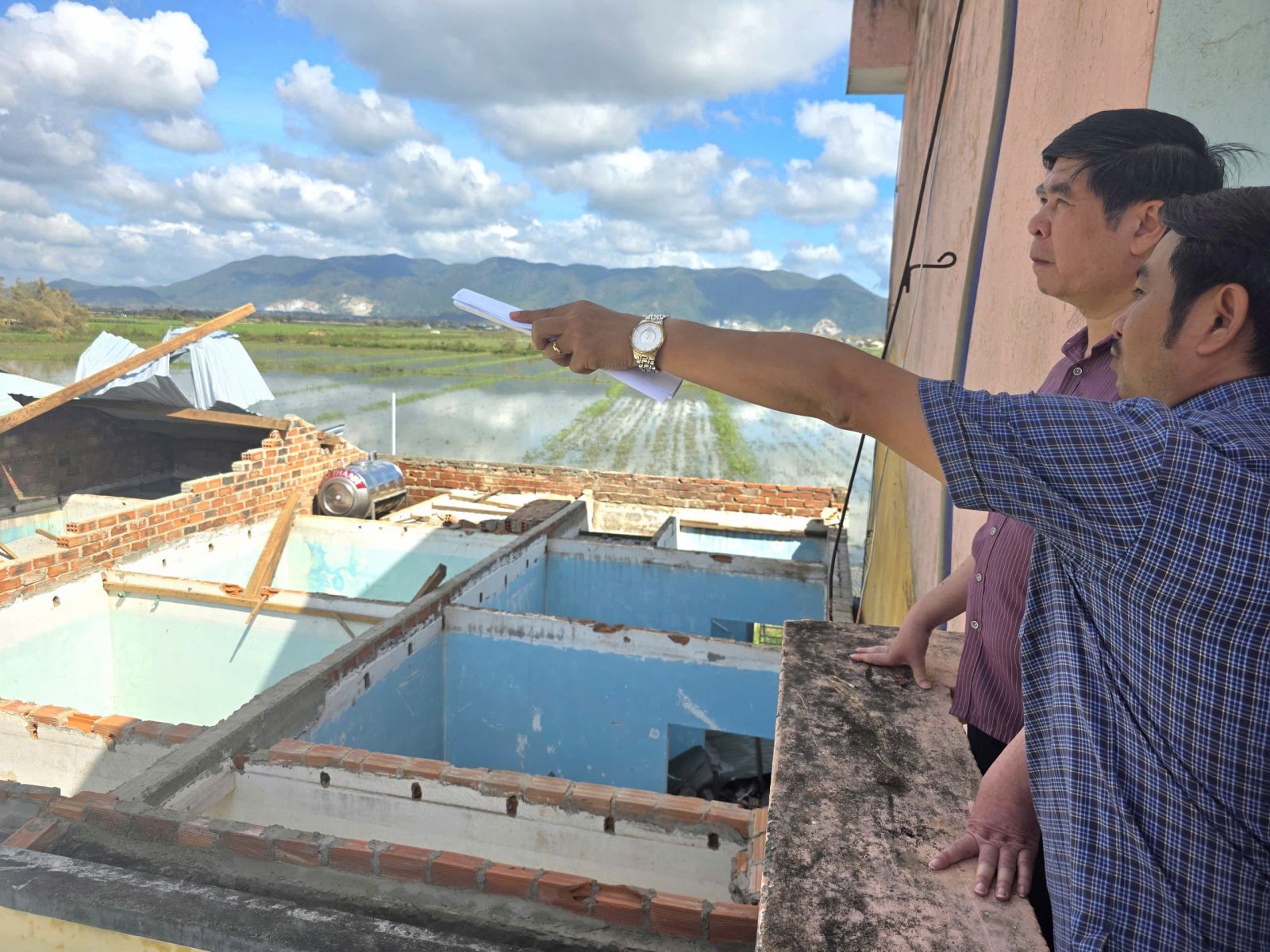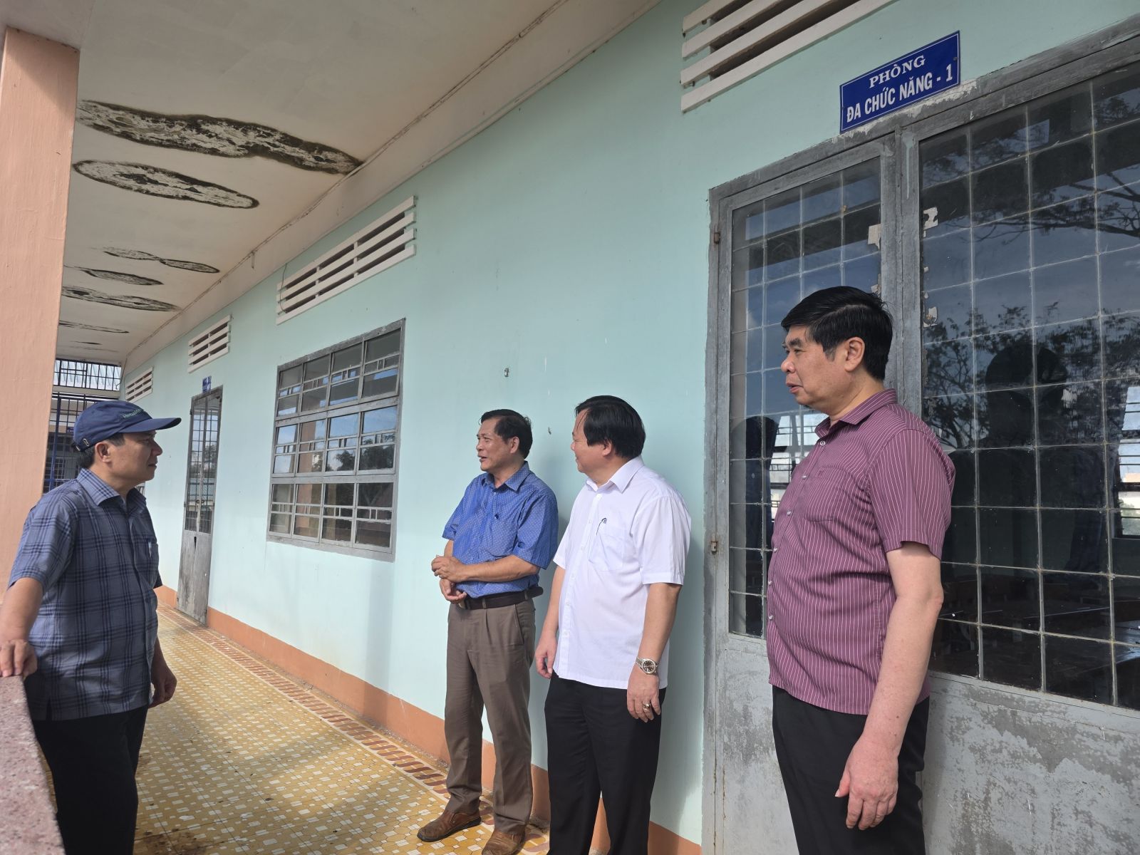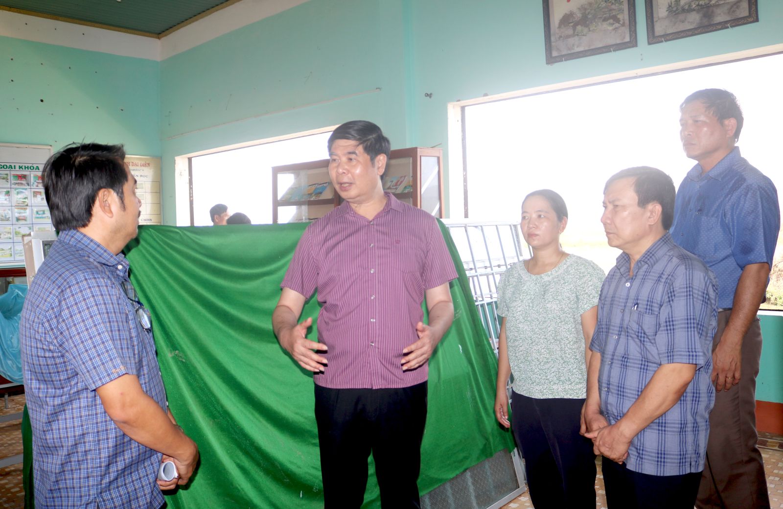 Phó Chủ tịch UBND tỉnh Lâm Hải Giang kiểm tra điểm trường THCS Nhơn Hạnh bị tốc mái nhà công vụ, vỡ kính sau bão số 13.