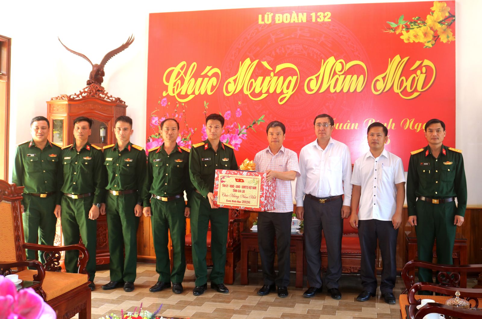 Phó Chú tịch UBND tỉnh Nguyễn Hữu Quế (thứ 5, bên trái sang) thăm, tặng quà Sư đoàn 2.