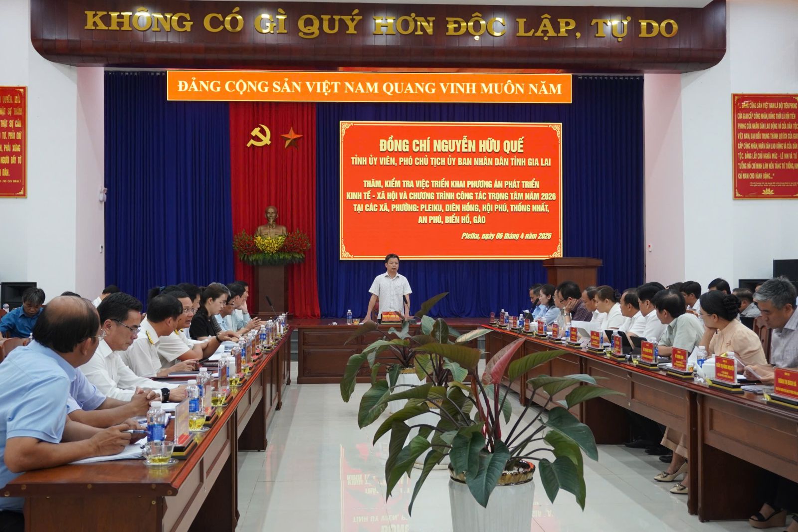 Đồng chí cũng đã thông tin sơ bộ về kết quả nổi bật của tỉnh trong quý I vừa qua. Về phía tỉnh ghi nhận và đánh giá cao sự nỗ lực, cố gắng của các xã, phường thuộc địa bàn thành phố Pleiku trước đây sau thời gian sáp nhập, tổ chức vận hành theo mô hình chính quyền địa phương hai cấp, đáng chú ý là những nỗ lực trong lĩnh vực thu hút đầu tư, phát triển hoạt động du lịch, cải cách thủ tục hành chính.