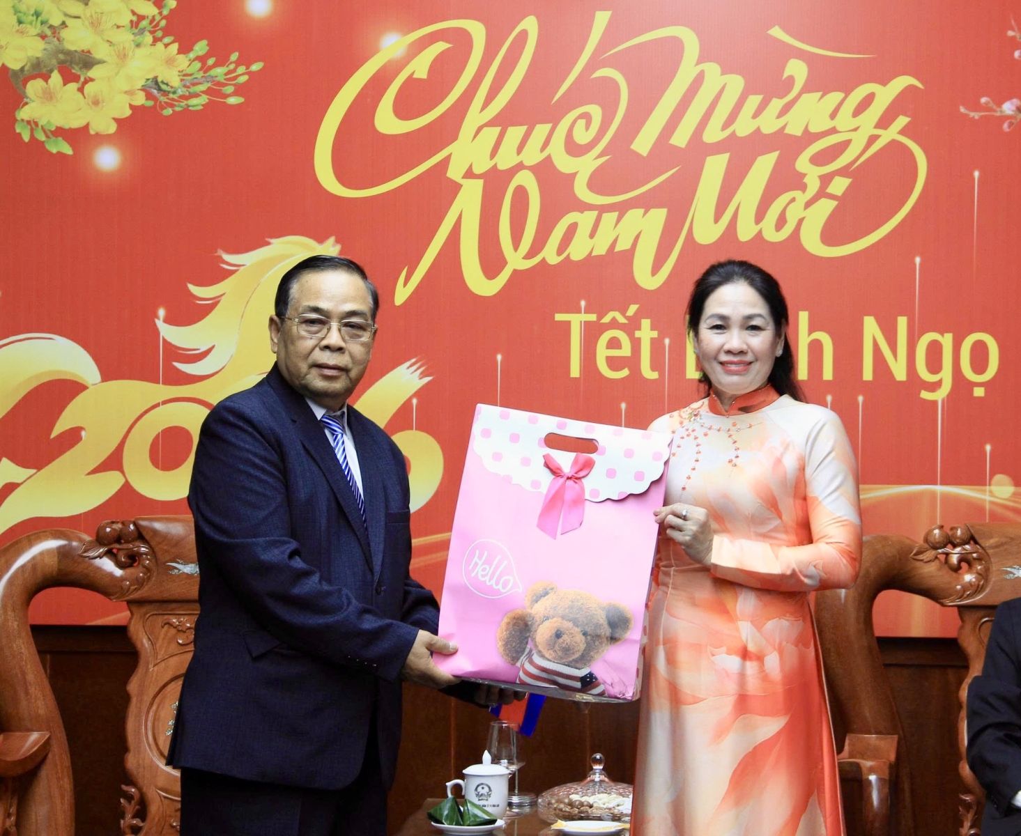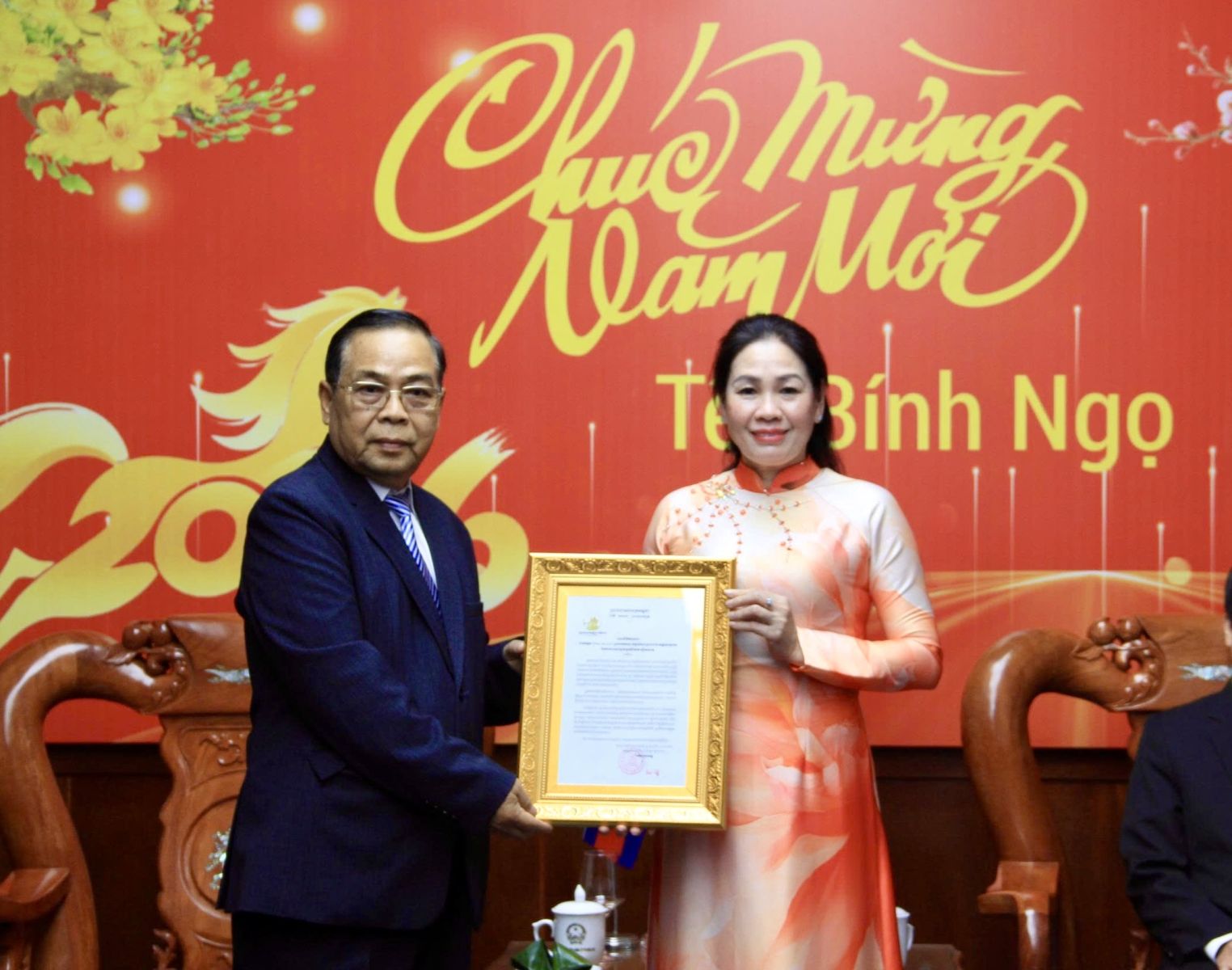 Phó Chủ tịch HĐND tỉnh Huỳnh Thúy Vân nhận quà và Thư chúc mừng năm mới của tỉnh Preah Vihear