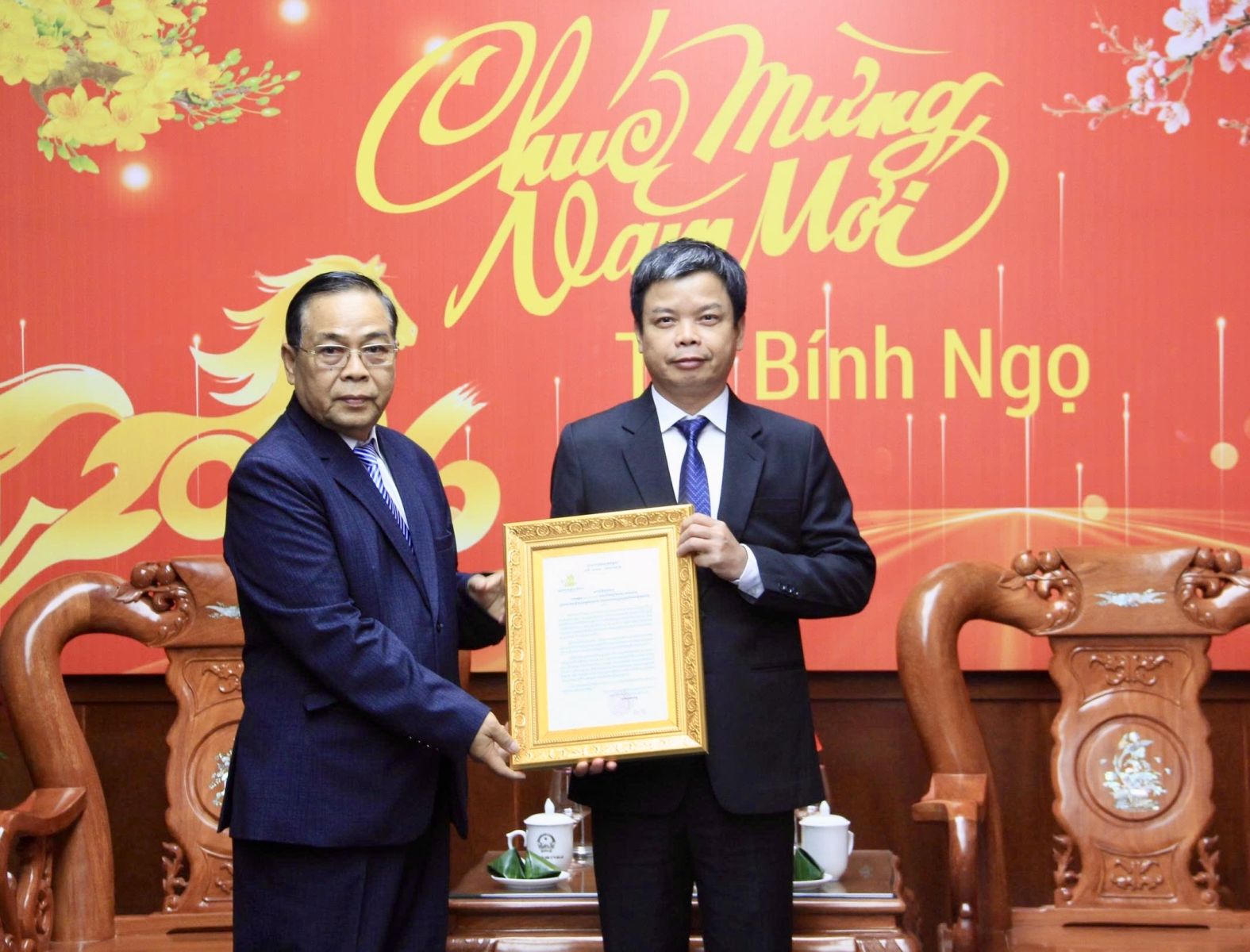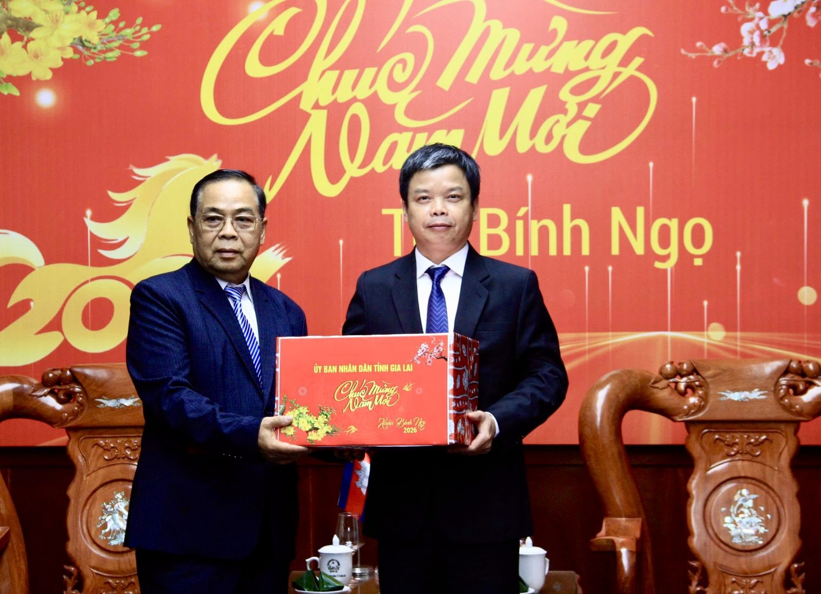 Ngài Toch Vong tặng quà và trao Thư chúc mừng năm mới cho Phó Chủ tịch UBND tỉnh Nguyễn Hữu Quế