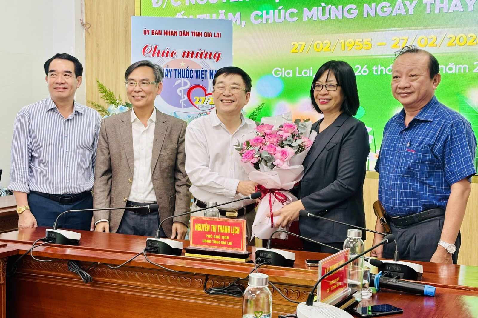 Lãnh đạo Bệnh viện Đa khoa Trung tâm Gia Lai tặng hoa chúc mừng đồng chí Nguyễn Thị Thanh Lịch - nguyên Bác sĩ chuyên khoa II