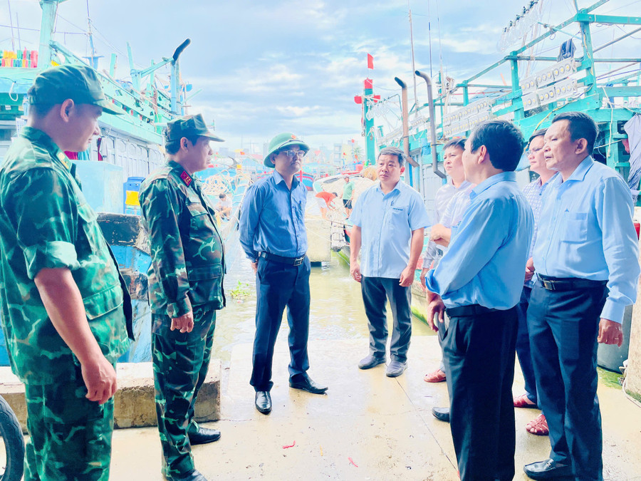 Phó Chủ tịch UBND tỉnh Nguyễn Tự Công Hoàng (thứ 3 từ trái sang) kiểm tra công tác neo đậu tàu tại Cảng cá Tam Quan, phường Hoài Nhơn Bắc. Ảnh: Phi Long