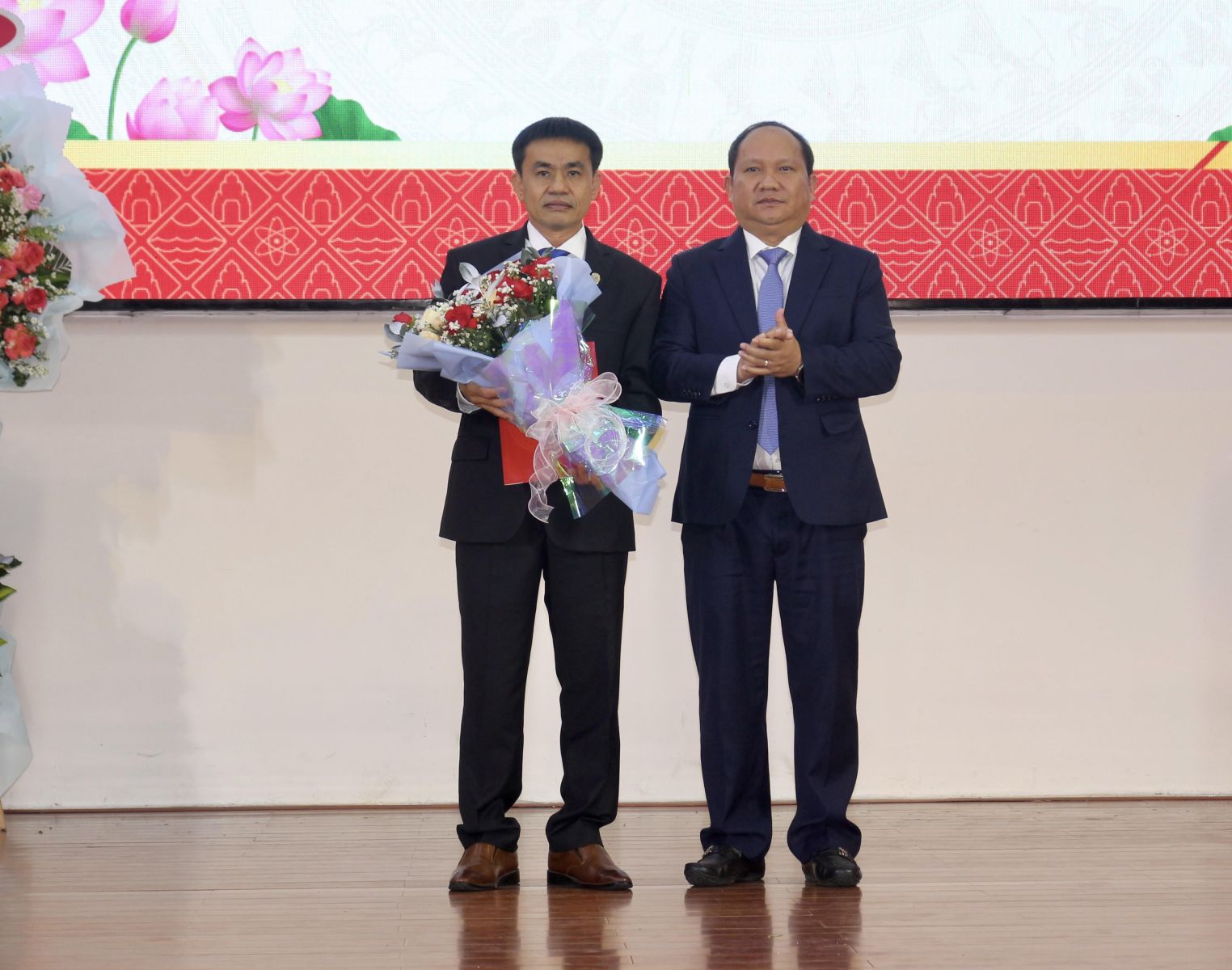 Đồng chí Lâm Hải Giang (bìa trái) tặng hoa chúc mừng PGS.TS. Đoàn Đức Tùng