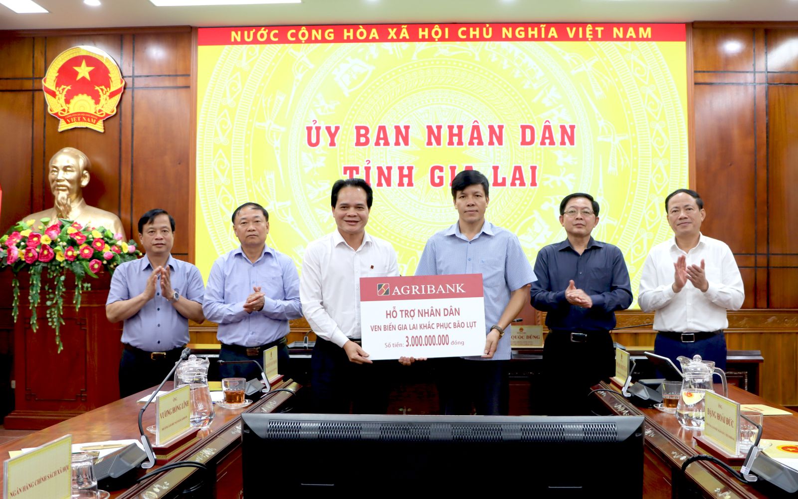 Đại diện lãnh đạo Ngân hàng Agribank (thứ 3, bên trái sang) trao bảng tượng trưng 03 tỷ đồng cho lãnh đạo Ủy ban MTTQ Việt Nam tỉnh Gia Lai.