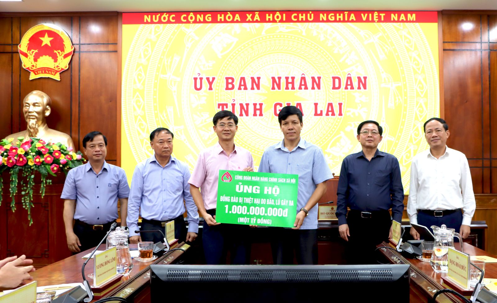 Tại buổi làm việc, đại diện lãnh đạo Ngân hàng Vietcombank trao bảng tượng trưng 05 tỷ đồng; đại diện lãnh đạo Ngân hàng Agribank trao bảng tượng trưng 03 tỷ đồng và đại diện lãnh đạo Ngân hàng Chính sách xã hội - Chi nhánh Gia Lai trao bảng tượng trưng 01 tỷ đồng cho lãnh đạo Ủy ban MTTQ Việt Nam tỉnh Gia Lai.