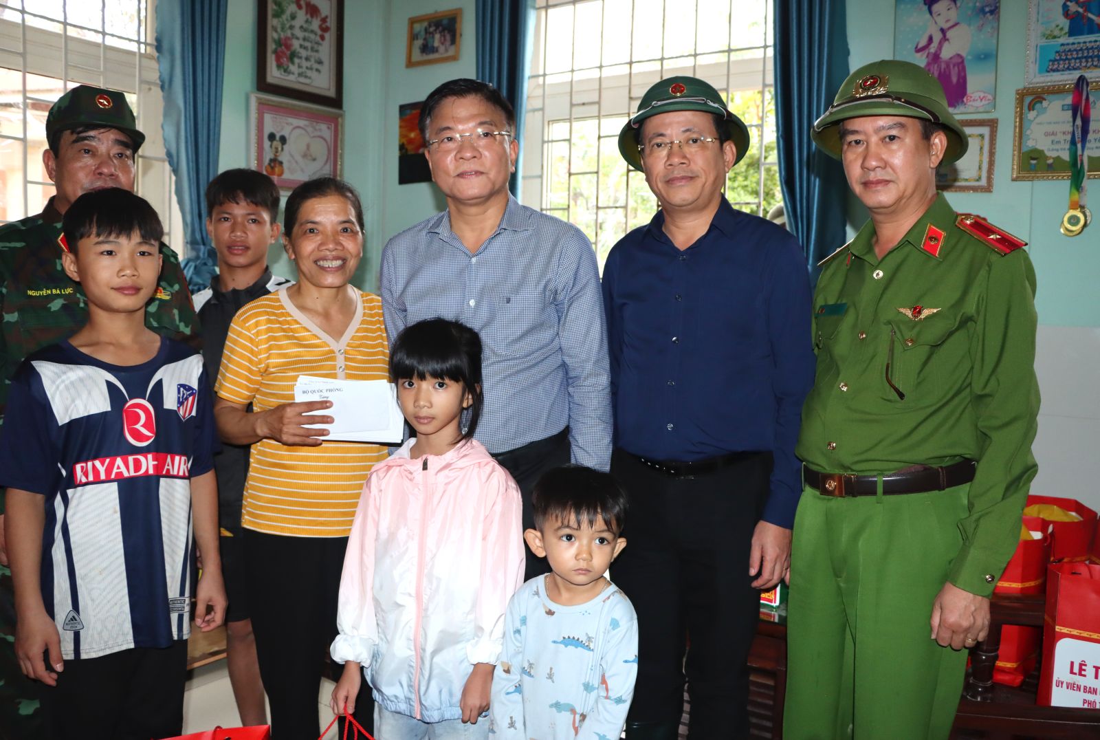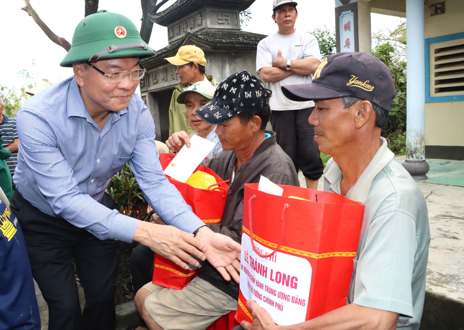 Phó Thủ tướng Chính phủ Lê Thành Long và lãnh đạo tỉnh tặng quà, động viên bà con bị thiệt hại do mưa lũ.