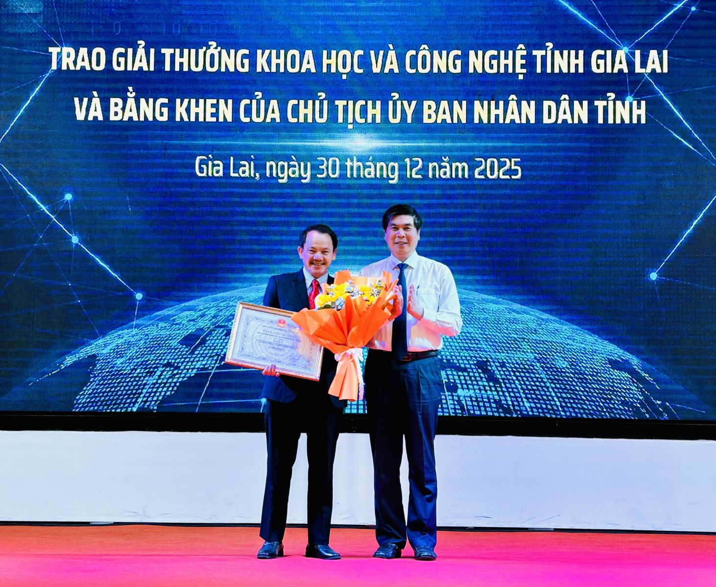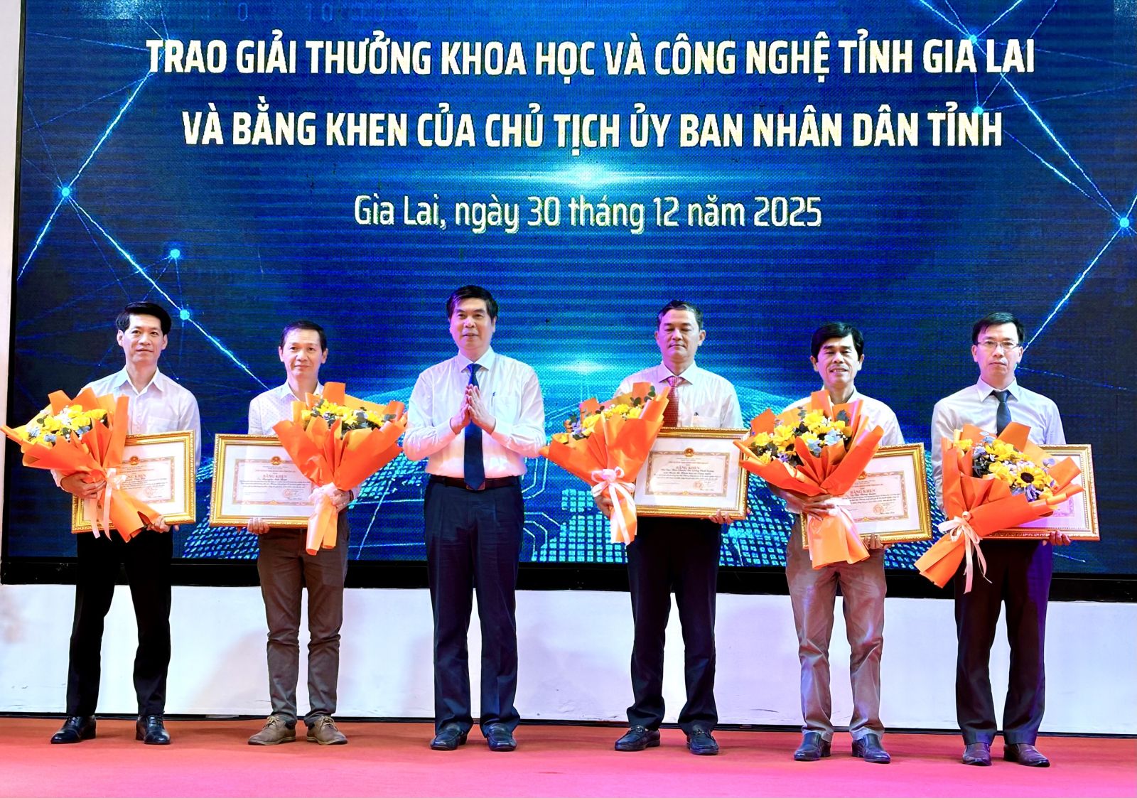 Dịp này, UBND tỉnh trao tặng Giải thưởng Khoa học và Công nghệ tỉnh Gia Lai lần thứ nhất năm 2024 cho 5 công trình khoa học và công nghệ (1 giải A, 1 giải B và 3 giải khuyến khích). 2 tập thể và 4 cá nhân được nhận Bằng khen của Chủ tịch UBND tỉnh vì có thành tích xuất sắc trong thực hiện chương trình quốc gia hỗ trợ doanh nghiệp nâng cao năng suất và chất lượng sản phẩm hàng hóa giai đoạn 2021-2025.