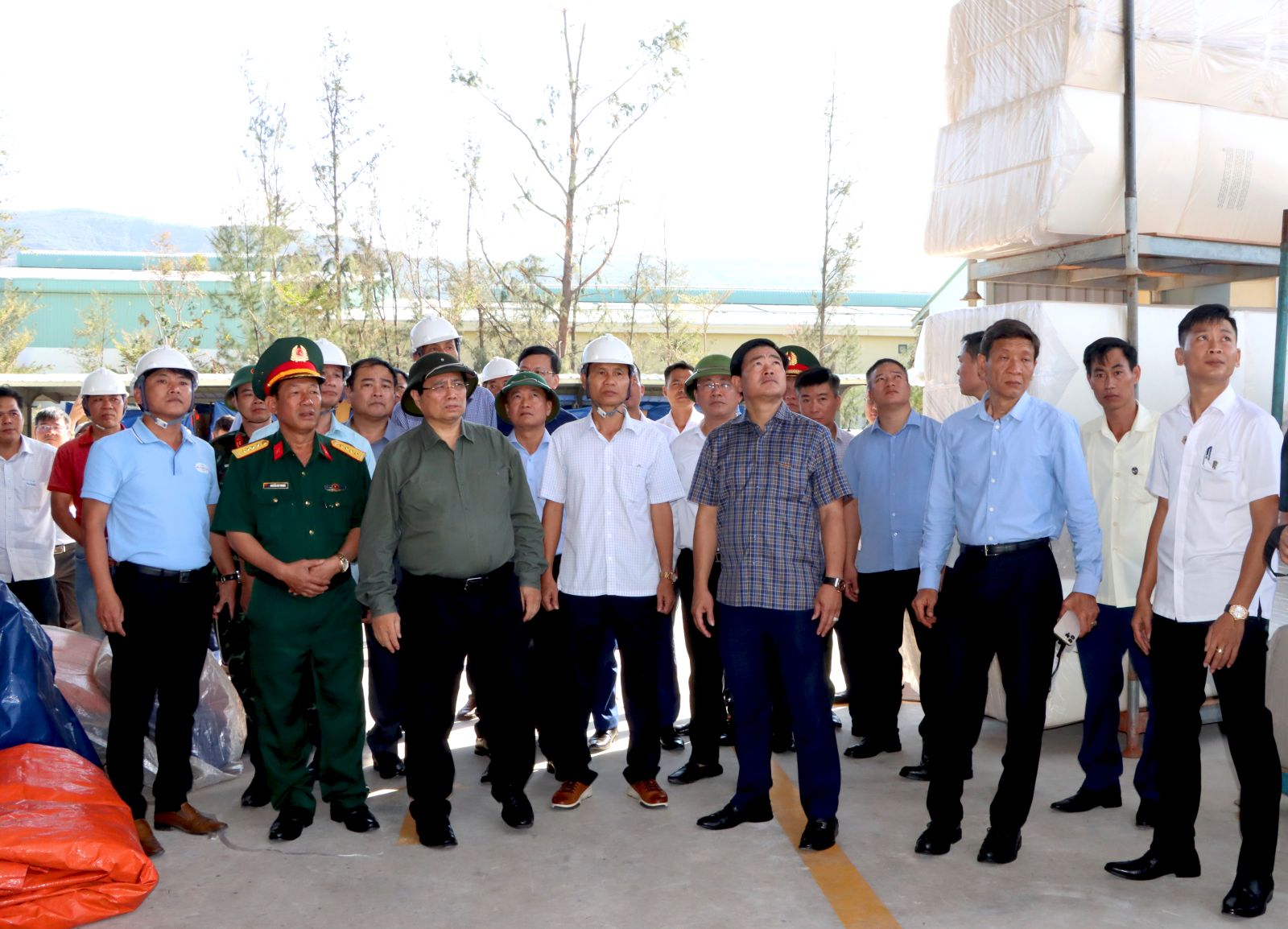 Thủ tướng Chính phủ Phạm Minh Chính (thứ 3, từ trái sang) thăm các doanh nghiệp thiệt hại do bão số 13 tại Khu kinh tế Nhơn Hội.