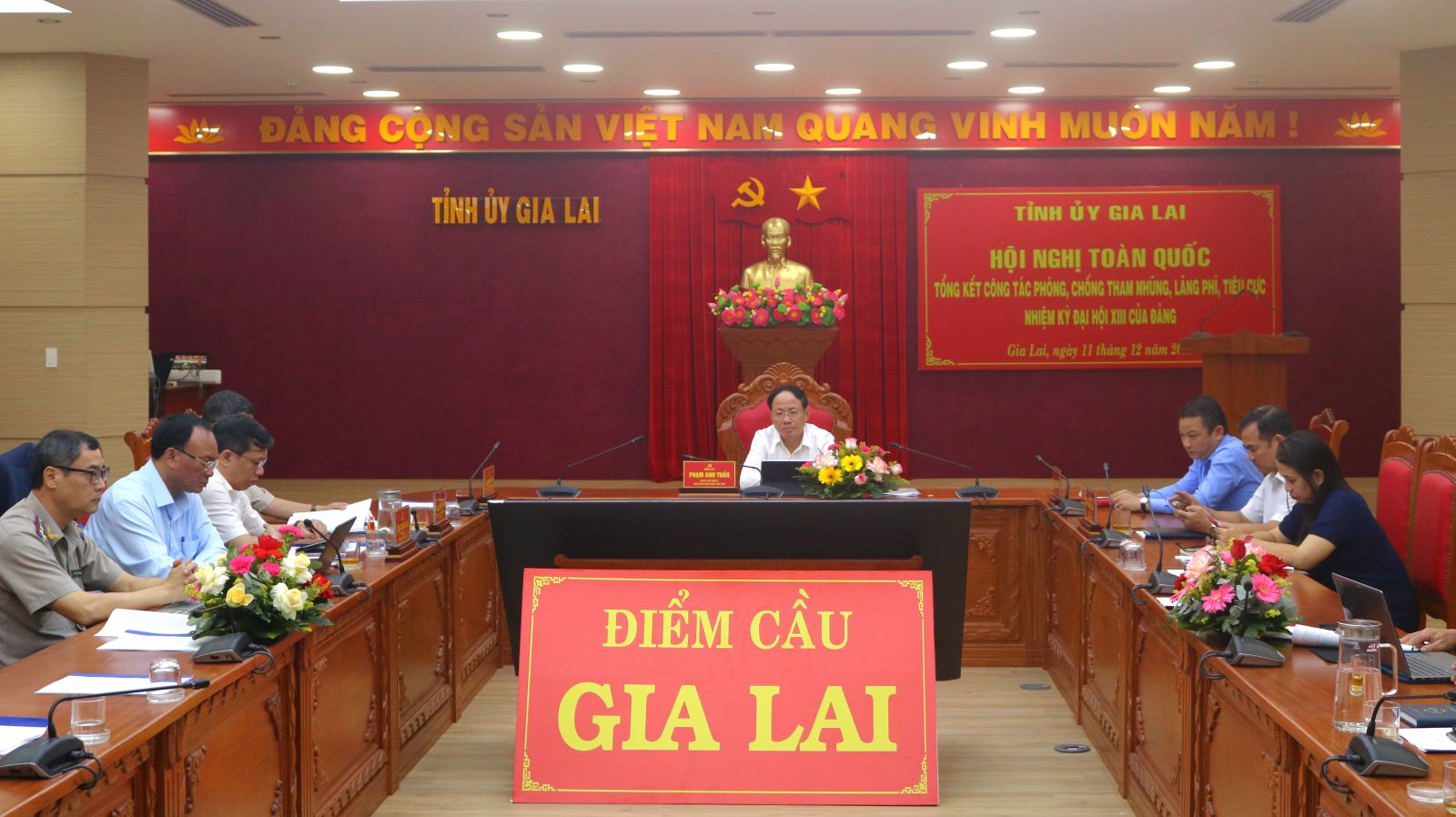 Dự hội nghị tại điểm cầu tỉnh Gia Lai có các đồng chí: Phạm Anh Tuấn - Phó Bí thư Tỉnh ủy, Chủ tịch UBND tỉnh; thành viên Ban chỉ đạo phòng, chống tham nhũng, lãng phí, tiêu cực tỉnh; đại diện lãnh đạo HĐND, UBND, Đoàn đại biểu Quốc hội, Ủy ban MTTQ, các đoàn thể chính trị - xã hội của tỉnh; đại diện lãnh đạo các ban của Tỉnh ủy; đại diện lãnh đạo các sở, ban, ngành, đơn vị liên quan.