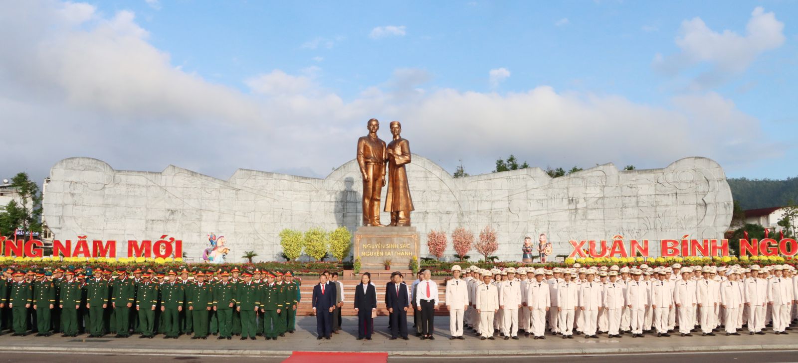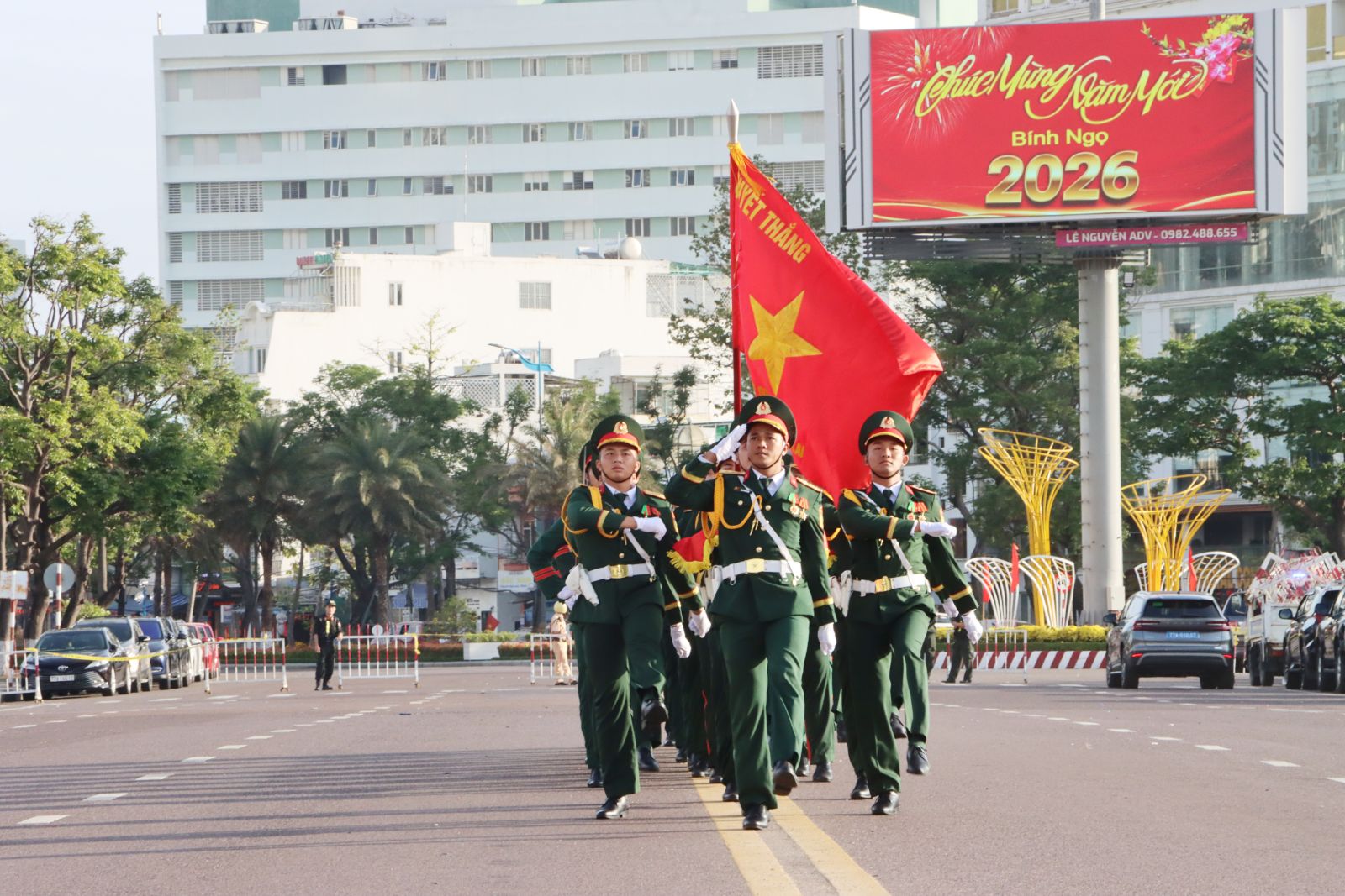Đội tiêu binh trang nghiêm diễu hành qua Tượng đài Nguyễn Sinh Sắc - Nguyễn Tất Thành