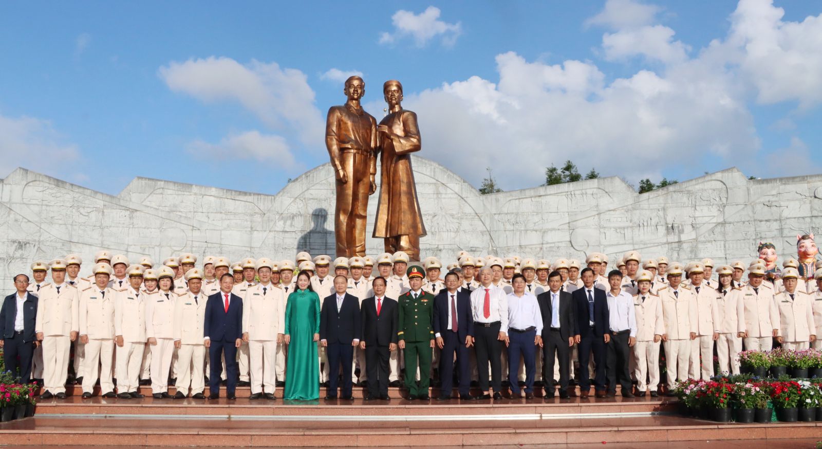 Đại biểu chụp hình lưu niệm trước Tượng đài Nguyễn Sinh Sắc - Nguyễn Tất Thành