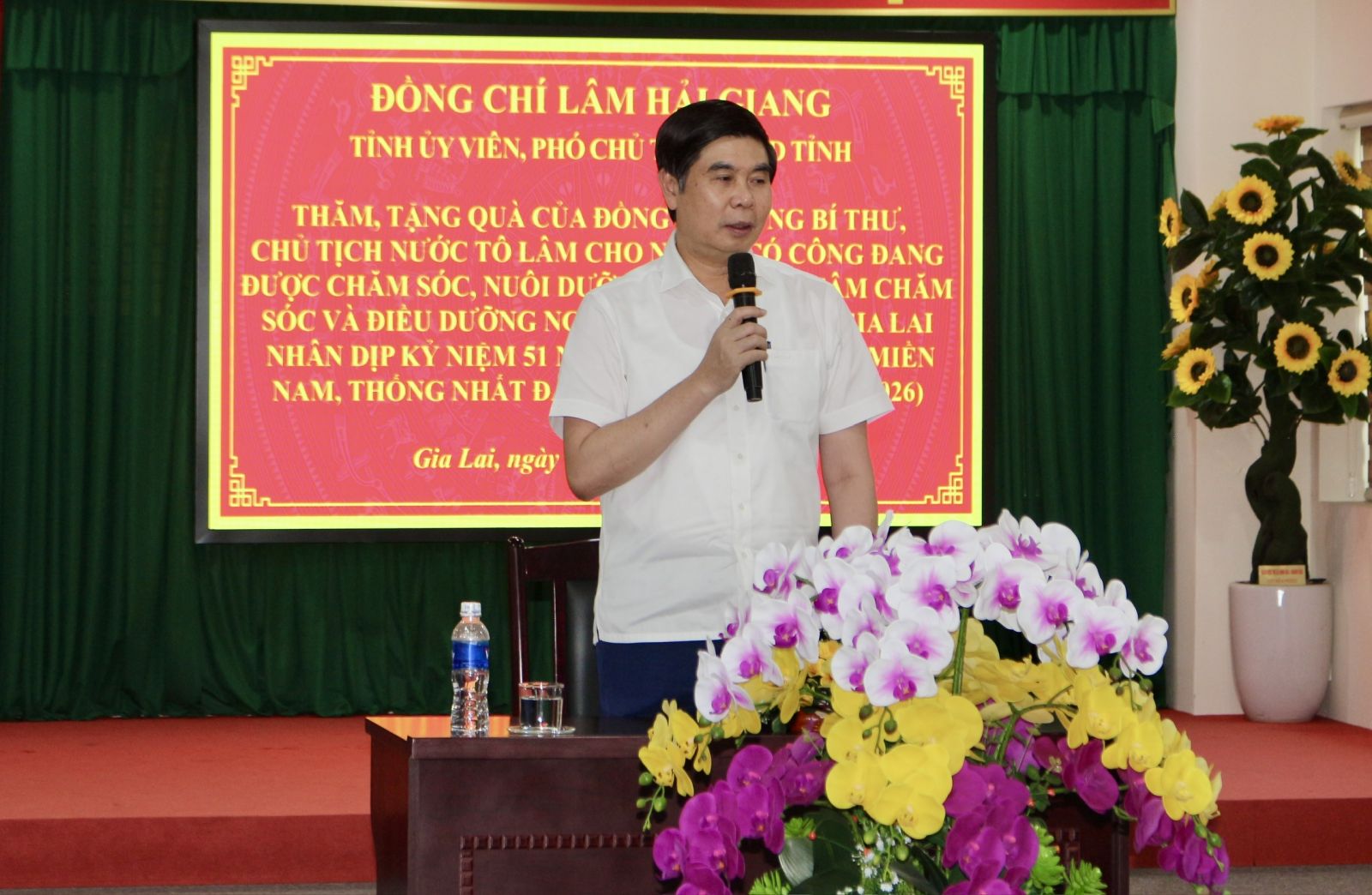 Đồng chí Lâm Hải Giang khẳng định, Đảng, Nhà nước và tỉnh Gia Lai luôn ghi nhớ công ơn của các anh hùng, liệt sĩ đã hy sinh vì nền hòa bình, độc lập của dân tộc. Tỉnh Gia Lai luôn dành sự quan tâm đặc biệt đối với người có công với cách mạng, coi đây là nhiệm vụ chính trị quan trọng, thể hiện đạo lý “Uống nước nhớ nguồn”. Đồng chí mong muốn các thương binh, bệnh binh tiếp tục phát huy truyền thống cách mạng, giữ vững tinh thần lạc quan, sống vui, sống khỏe, là điểm tựa tinh thần, tấm gương sáng cho các thế hệ noi theo.