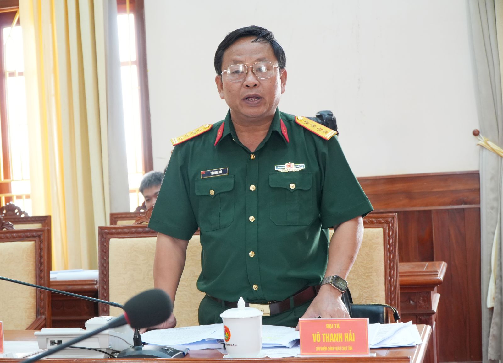 Đại tá Võ Thanh Hải - Chủ nhiệm Chính trị Bộ Chỉ huy Quân sự tỉnh phát biểu tại hội nghị.