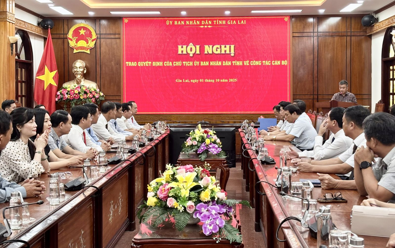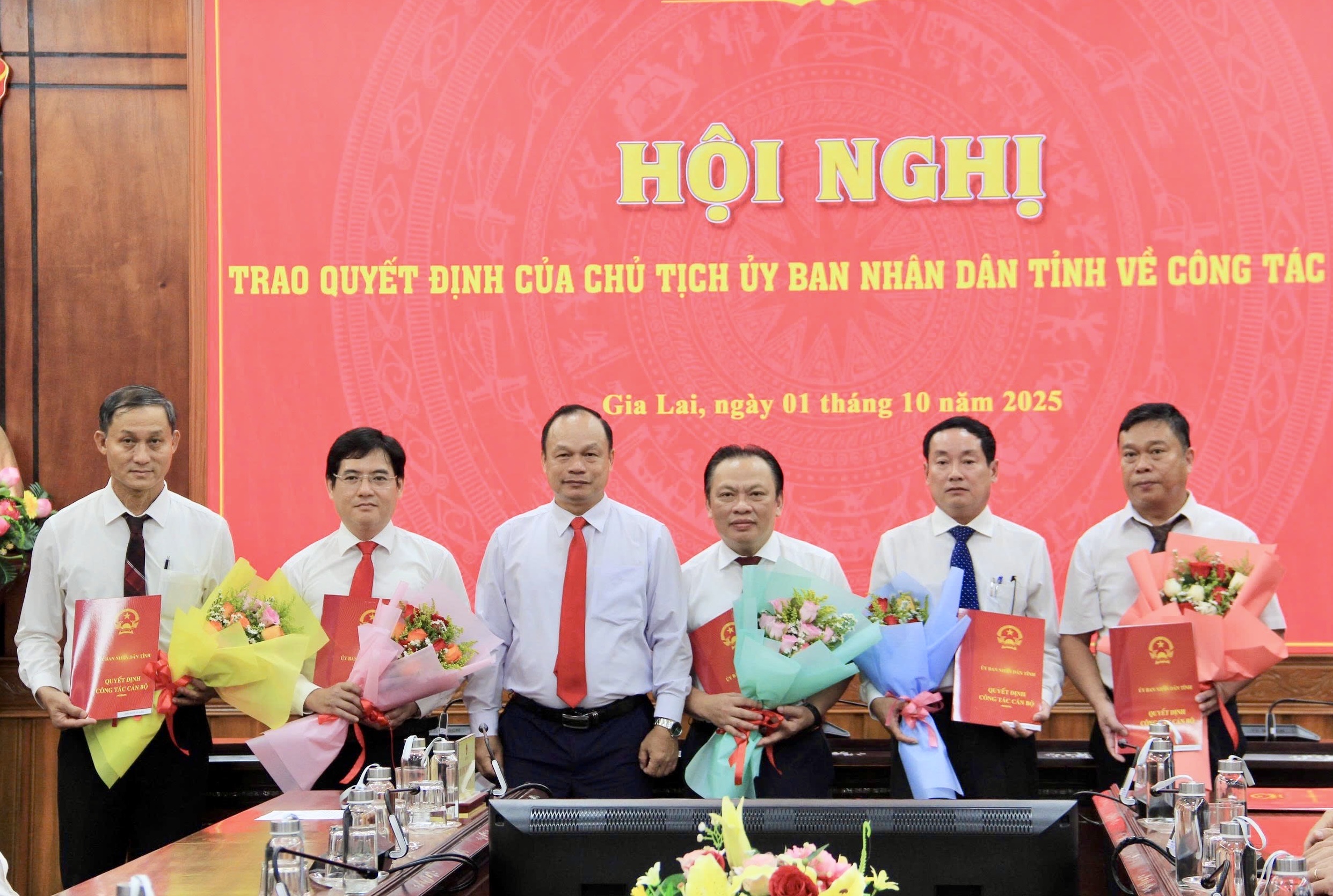 Theo đó tại hội nghị, Phó Giám đốc Sở Nội vụ Phạm Minh Trung đã công bố Quyết định số 1926/QĐ-UBND, ngày 25/9/2025 về việc điều động ông Nguyễn Bá Thạch, Phó Giám đốc Sở Dân tộc và Tôn giáo đến nhận công tác tại Thanh tra tỉnh và bổ nhiệm giữ chức vụ Phó Chánh Thanh tra tỉnh. Quyết định số 1968/QĐ-UBND, ngày 30/9/2025 về việc bổ nhiệm ông Lê Dũng Linh giữ chức vụ Giám đốc Trung tâm Phục vụ hành chính công tỉnh Gia Lai trực thuộc Văn phòng UBND tỉnh. Quyết định số 1875/QĐ-UBND, ngày 21/9/2025 về việc điều động ông Cái Minh Tùng, Chủ tịch Công ty TNHH Lâm nghiệp Hà Thanh đến nhận công tác tại Công ty TNHH Lâm nghiệp Quy Nhơn và bổ nhiệm giữ chức vụ Chủ tịch Công ty TNHH Lâm nghiệp Quy Nhơn. Quyết định số 1868/QĐ-UBND, ngày 19/9/2025 về việc điều động ông Trần Nguyên Tú, Chủ tịch Công ty TNHH Lâm nghiệp Quy Nhơn đến nhận công tác tại Công ty TNHH Lâm nghiệp Hà Thanh và bổ nhiệm giữ chức vụ Chủ tịch Công ty TNHH Lâm Nghiệp Hà Thanh. Quyết định số 1936/QĐ-UBND, ngày 26/9/2025 về việc bổ nhiệm ông Nguyễn Gần, Trưởng phòng Phòng Điều hành dự án 1 thuộc Ban Quản lý dự án đầu tư xây dựng các công trình nông nghiệp và phát triển nông thôn tỉnh giữ chức vụ Phó Giám đốc Ban Quản lý dự án đầu tư xây dựng các công trình nông nghiệp và phát triển nông thôn tỉnh.