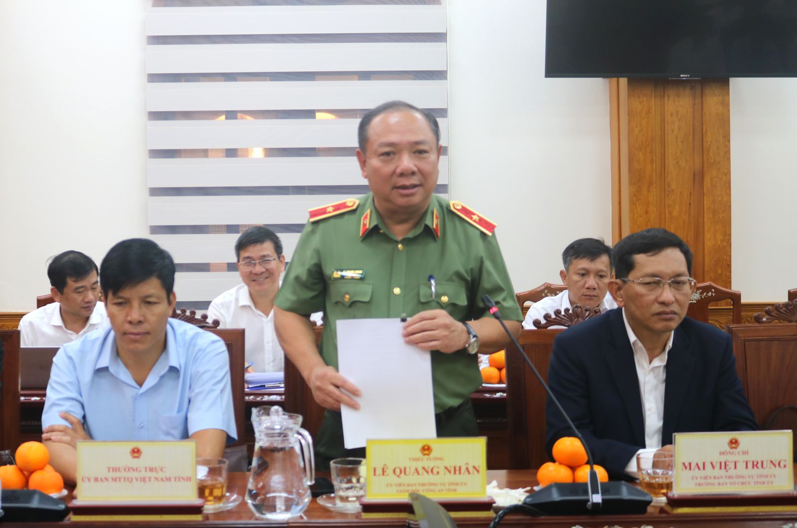 Giám đốc Công an tỉnh Lê Quang Nhân báo cáo công tác đảm bảo an ninh chính trị, trật tự an toàn xã hội trên địa bàn tỉnh.