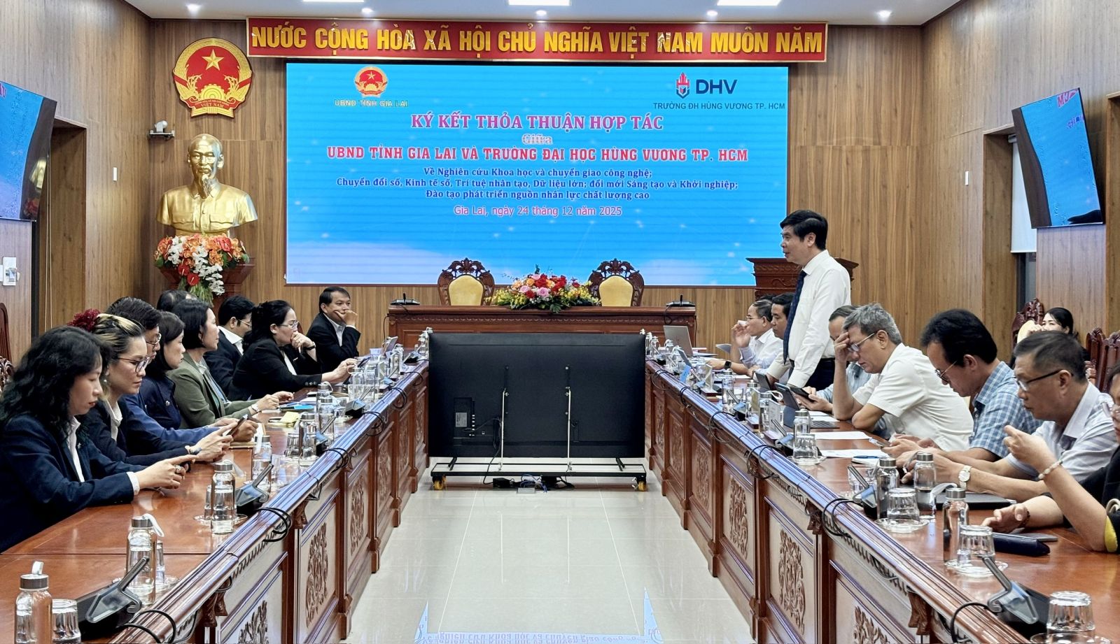 Giới thiệu về tiềm lực và định hướng hợp tác của nhà trường, TS. Trần Việt Anh cho biết: Trường Đại học Hùng Vương TP. Hồ Chí Minh là trường đại học công lập, được thành lập năm 1995. Hiện nay nhà trường tập trung định hướng đổi mới sáng tạo và khởi nghiệp, đồng thời tham gia mạng lưới trí tuệ nhân tạo (AI) quốc tế, tạo nền tảng thuận lợi cho hợp tác đào tạo và nghiên cứu với các địa phương. Bên cạnh đó, nhà trường có thế mạnh trong đào tạo đa ngành, gắn đào tạo với thực tiễn, chú trọng ứng dụng khoa học – công nghệ và chuyển giao tri thức vào sản xuất, kinh doanh và quản lý nhà nước. Với đội ngũ giảng viên có trình độ cao, hệ thống cơ sở vật chất ngày càng được đầu tư đồng bộ, Trường Đại học Hùng Vương TP. Hồ Chí Minh sẵn sàng đồng hành cùng tỉnh Gia Lai trong đào tạo, bồi dưỡng nguồn nhân lực, nghiên cứu khoa học và triển khai các mô hình hợp tác phù hợp với nhu cầu phát triển của địa phương.