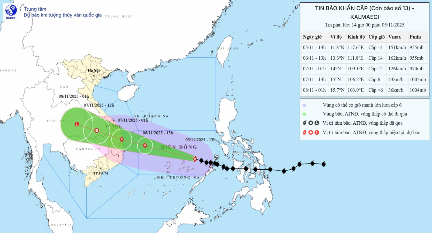 Bản đồ dự báo quỹ đạo và cường độ của bão phát lúc 14h00, ngày 05/11/2025