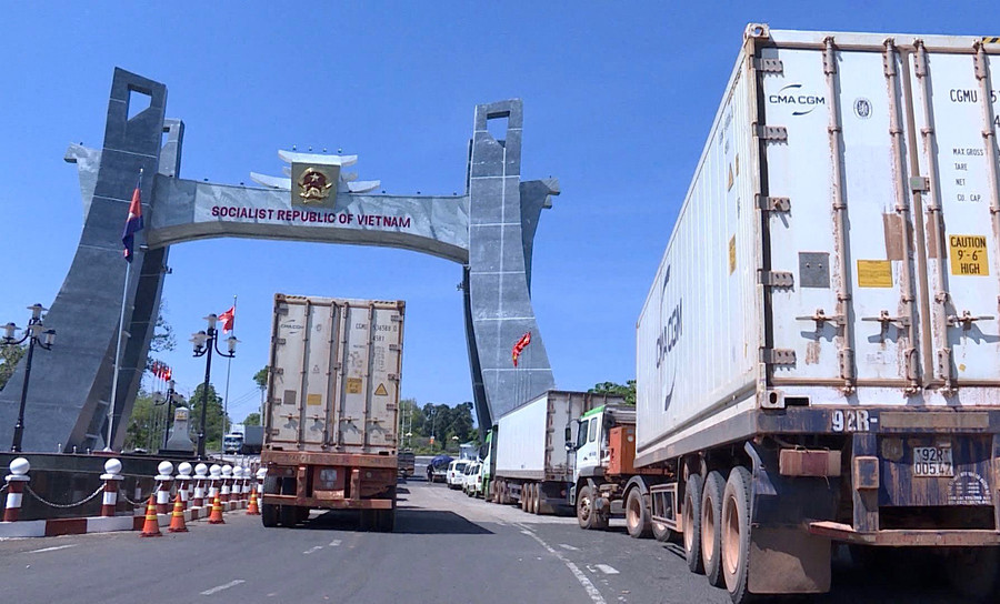Xe chở hàng hóa từ Campuchia nhập khẩu sang Việt Nam thông qua Cửa khẩu Quốc tế Lệ Thanh. Ảnh Hà Duy