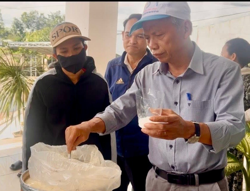 Cán bộ Trung tâm Kiểm soát bệnh tật tỉnh hướng dẫn cán bộ, nhân viên Trung tâm Y tế Ayun Pa khử khuẩn nước sau bão, lũ. Ảnh: CTV