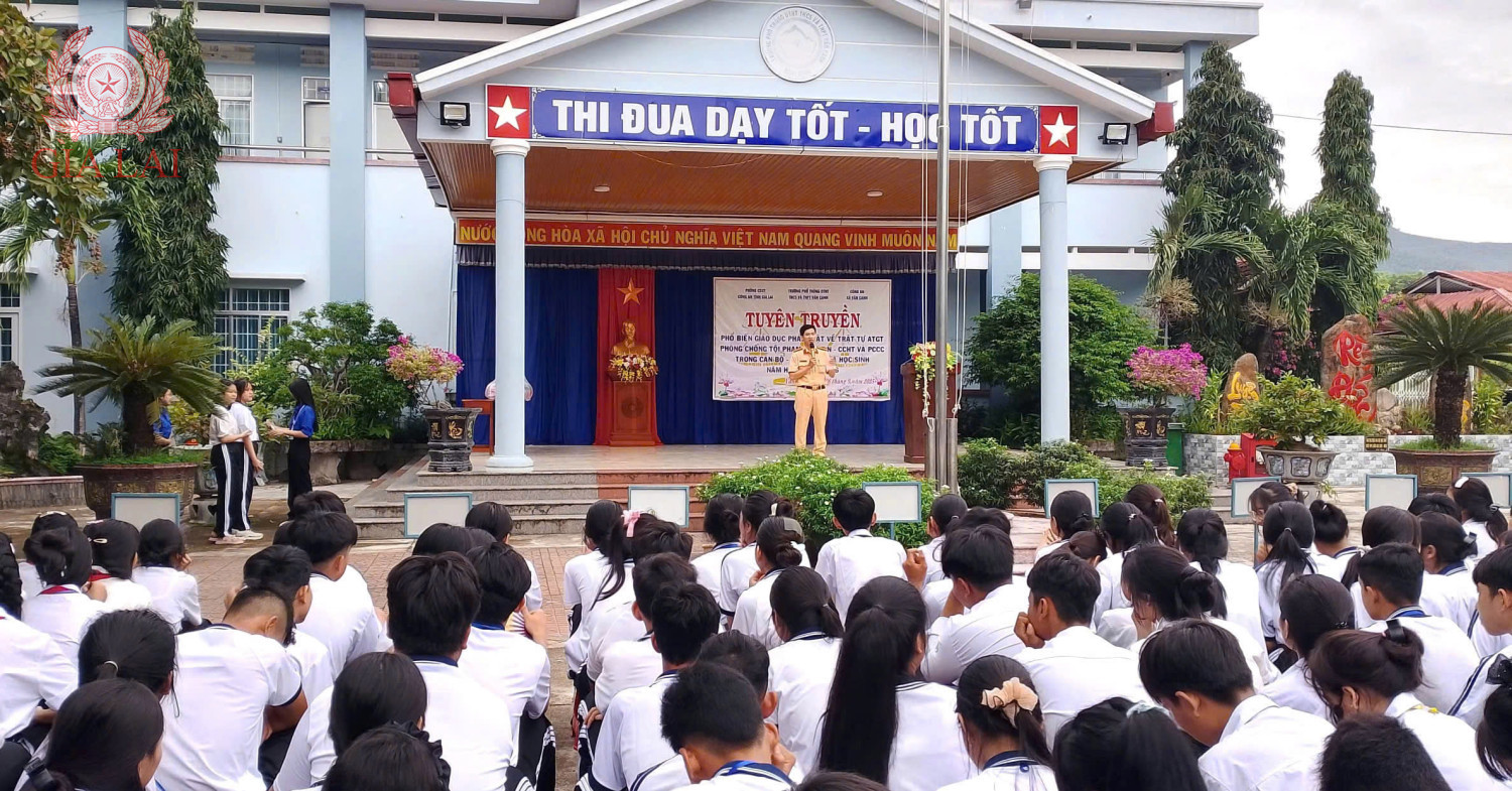 Phòng Cảnh sát giao thông Công an tỉnh phối hợp Công an xã Vân Canh (tỉnh Gia Lai) tổ chức tuyên truyền, phổ biến kiến thức pháp luật về an toàn giao thông, kỹ năng tham gia giao thông an toàn cho 1.000 học sinh, giáo viên Trường phổ thông dân tộc nội trú THCS và THPT Vân Canh (xã Vân Canh). Ảnh nguồn congan.gialai.gov.vn