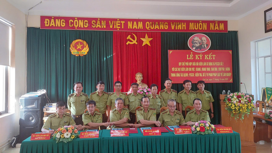 Đội Kiểm lâm cơ động và PCCCR số 2 (Chi cục Kiểm lâm tỉnh Gia Lai) ký kết quy chế phối hợp trong quản lý, bảo vệ và PCCCR với 5 hạt kiểm lâm khu vực Kbang, Mang Yang, Đak Đoa, Chư Păh và Ia Grai. Ảnh: baogialai.com.vn
