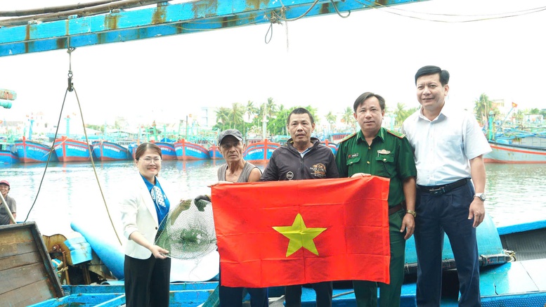 Lực lượng chức năng tỉnh Gia Lai trao cờ và lưới cụ cho ngư dân. (Ảnh: baochinh phu.vn)