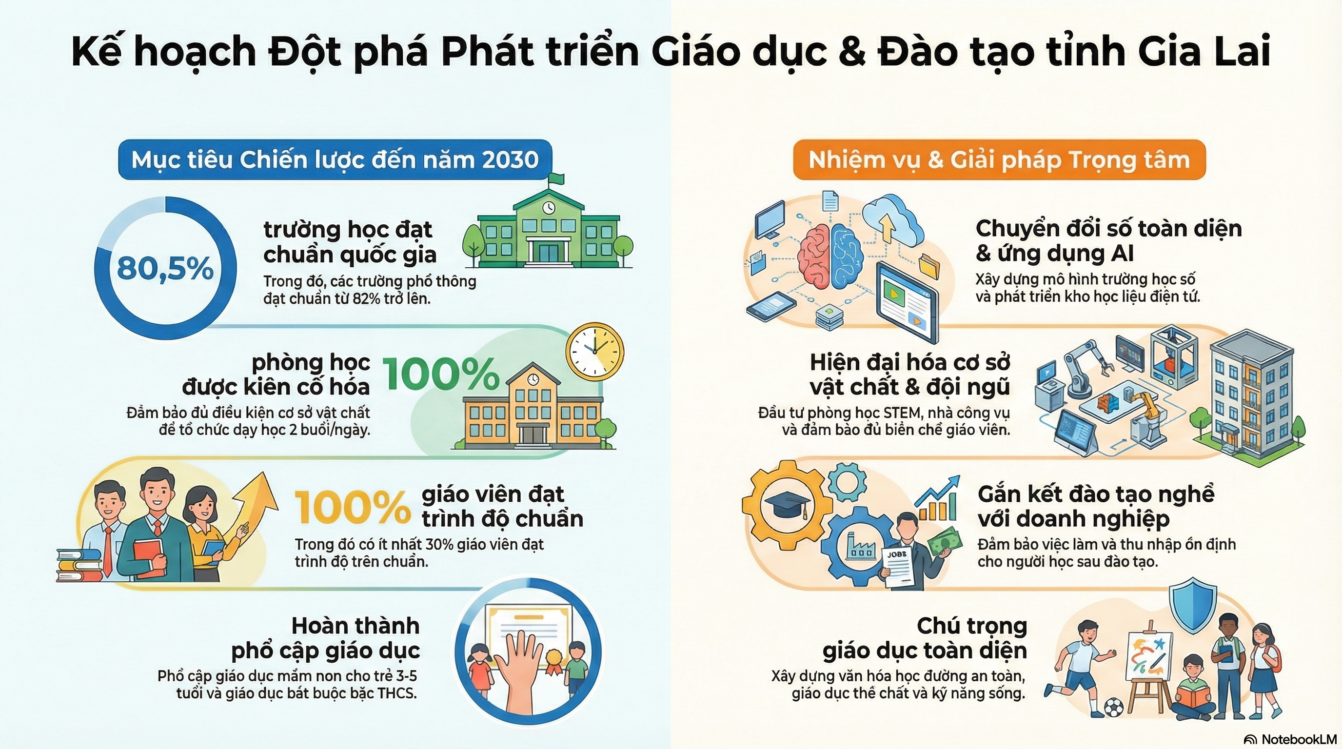 Tỉnh Gia Lai đặt mục tiêu quan trọng đến năm 2030, bao gồm phổ cập giáo dục mầm non cho trẻ em từ 3 đến 5 tuổi và hoàn thành phổ cập giáo dục bắt buộc bậc trung học cơ sở. Đồng thời, tỉnh phấn đấu đạt tỷ lệ học sinh dân tộc thiểu số tham gia học nghề ít nhất 30% và bảo đảm ít nhất 80,5% trường học đạt chuẩn quốc gia. Để đạt được những mục tiêu này, các nhiệm vụ trọng tâm được xác định là nâng cao nhận thức về vai trò của giáo dục, đổi mới chính sách phát triển giáo dục, và đặc biệt là nâng cao chất lượng đội ngũ giáo viên, đặc biệt ở các khu vực khó khăn.