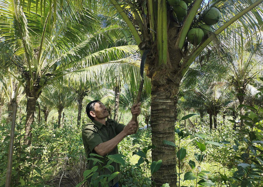 Ông Nguyễn Văn Khoa chăm sóc vườn dừa của gia đình chuẩn bị cho thu hoạch. Ảnh: Minh Khoa
