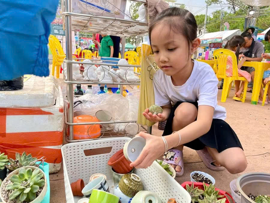 Tại khu sáng tạo dành cho trẻ em, Câu lạc bộ thiện nguyện Dấu chân xanh (trực thuộc Đoàn phường Pleiku) cũng triển khai các hoạt động rất phù hợp với các em thiếu nhi, đó là tô tượng, trồng sen đá, làm vòng đeo tay.