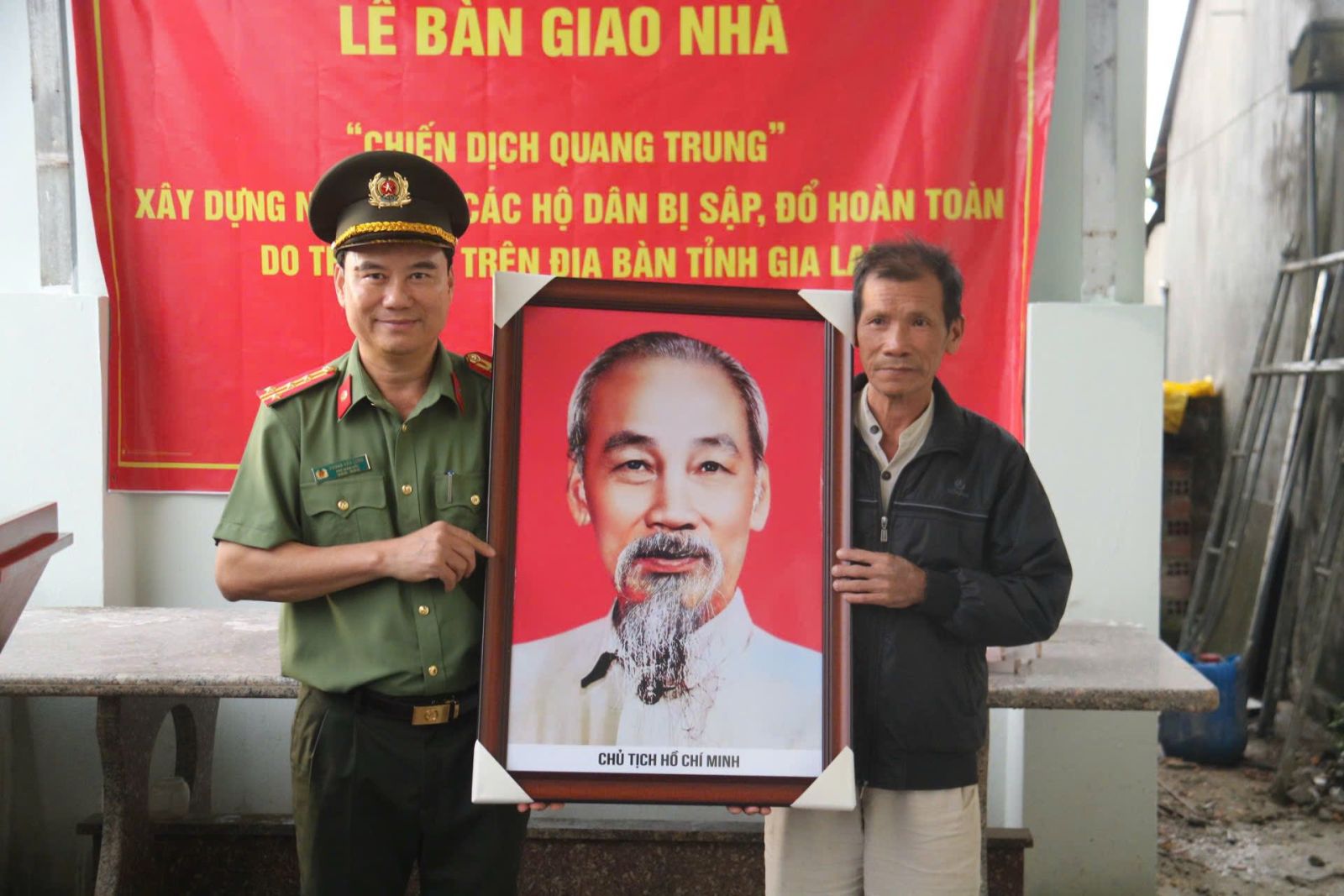 Tại các căn nhà mới hoàn thành, lãnh đạo Công an tỉnh đã trao tặng cờ Tổ quốc và ảnh Chủ tịch Hồ Chí Minh cho các hộ dân. Trong không gian của những mái ấm vừa được dựng lên, hình ảnh Bác Hồ tiếp tục khơi dậy tình cảm cách mạng, lòng biết ơn sâu sắc của Nhân dân đối với Đảng và Bác; lá cờ Tổ quốc là biểu tượng thiêng liêng của niềm tự hào dân tộc, tinh thần đoàn kết, ý chí kiên cường, bất khuất và khát vọng xây dựng đất nước phồn vinh, hạnh phúc.