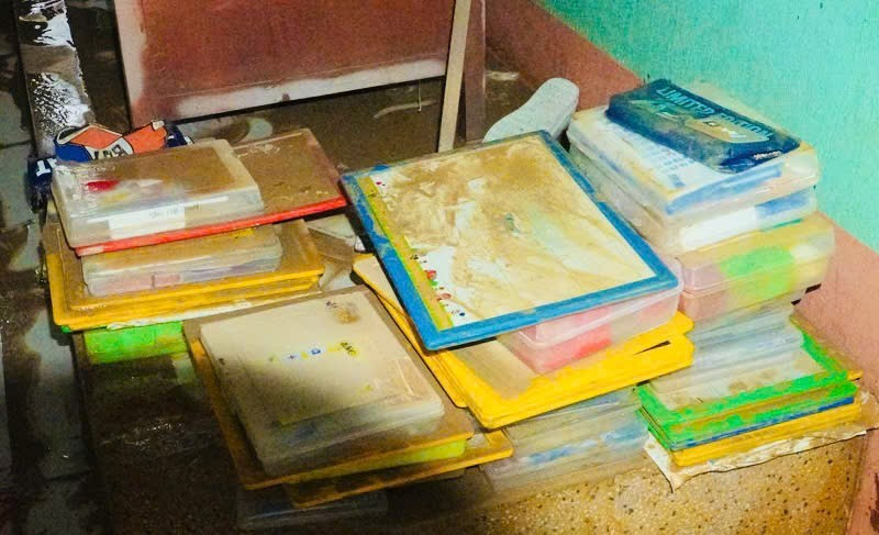 Mưa lũ làm ướt và hư hỏng nhiều bộ SGK và đồ dùng học tập của học sinh. Ảnh: Trần Dung