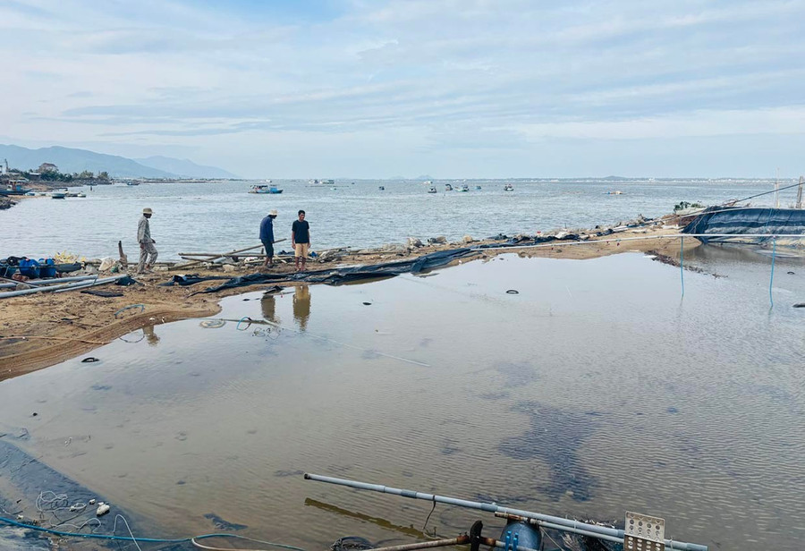 Anh Nguyễn Kim Trọng (thôn Ngãi An, xã Đề Gi) tranh thủ dọn dẹp 3 hồ nuôi tôm bị thiệt hại do bão số 13 và hy vọng Nhà nước hỗ trợ vốn tái sản xuất. Ảnh: H.T