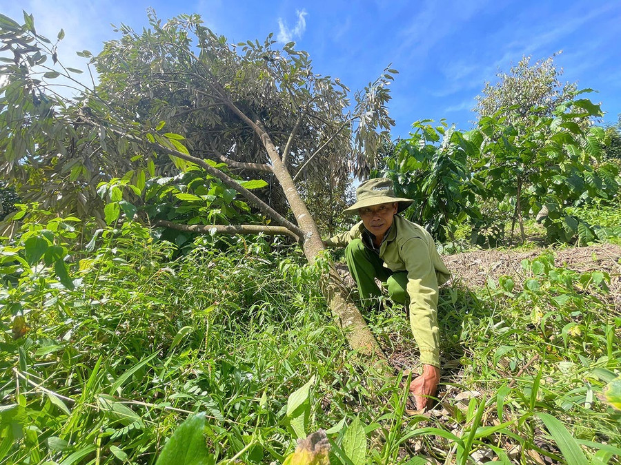 Không chỉ người nuôi thủy sản, các hộ trồng trọt và chăn nuôi cũng kiệt quệ sau bão. Tại xã Hra, ông Nguyễn Văn Chấn, Phó Chủ tịch UBND xã, cho biết hơn 400 ha cây trồng bị hư hại, thiệt hại ước trên 7 tỷ đồng, chủ yếu là sầu riêng, cà phê, keo và lúa.